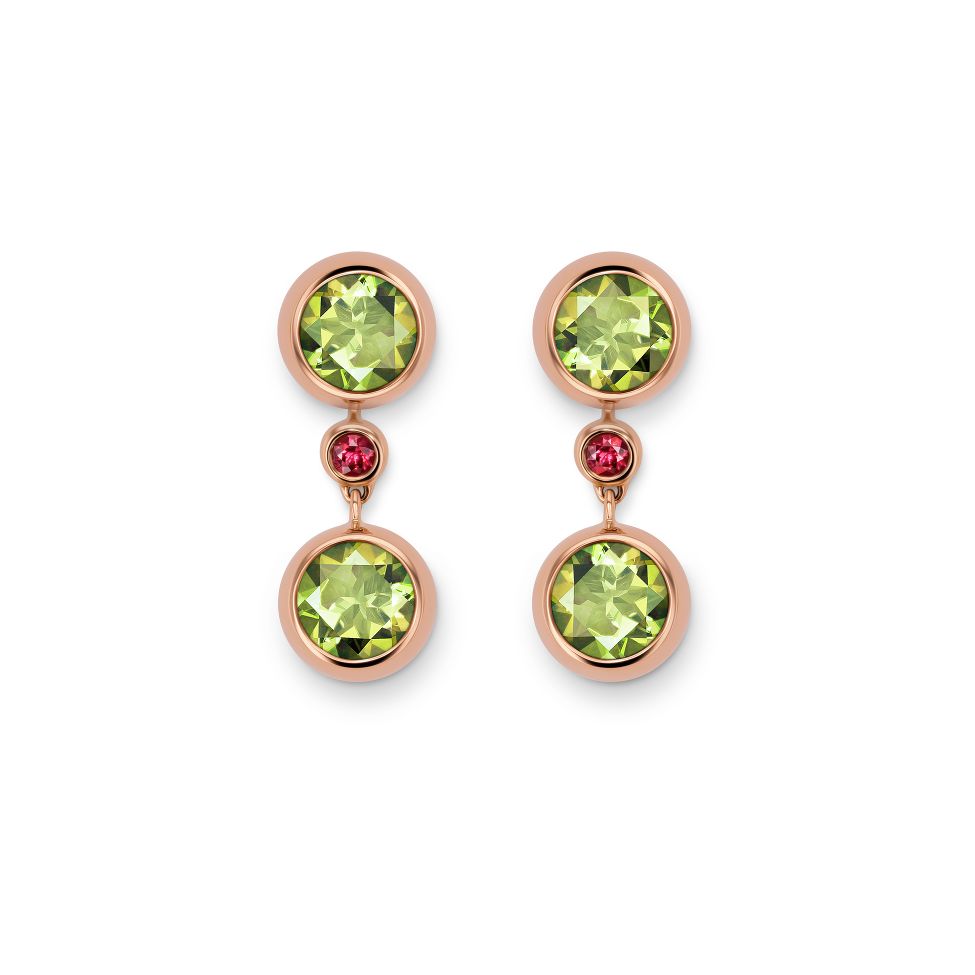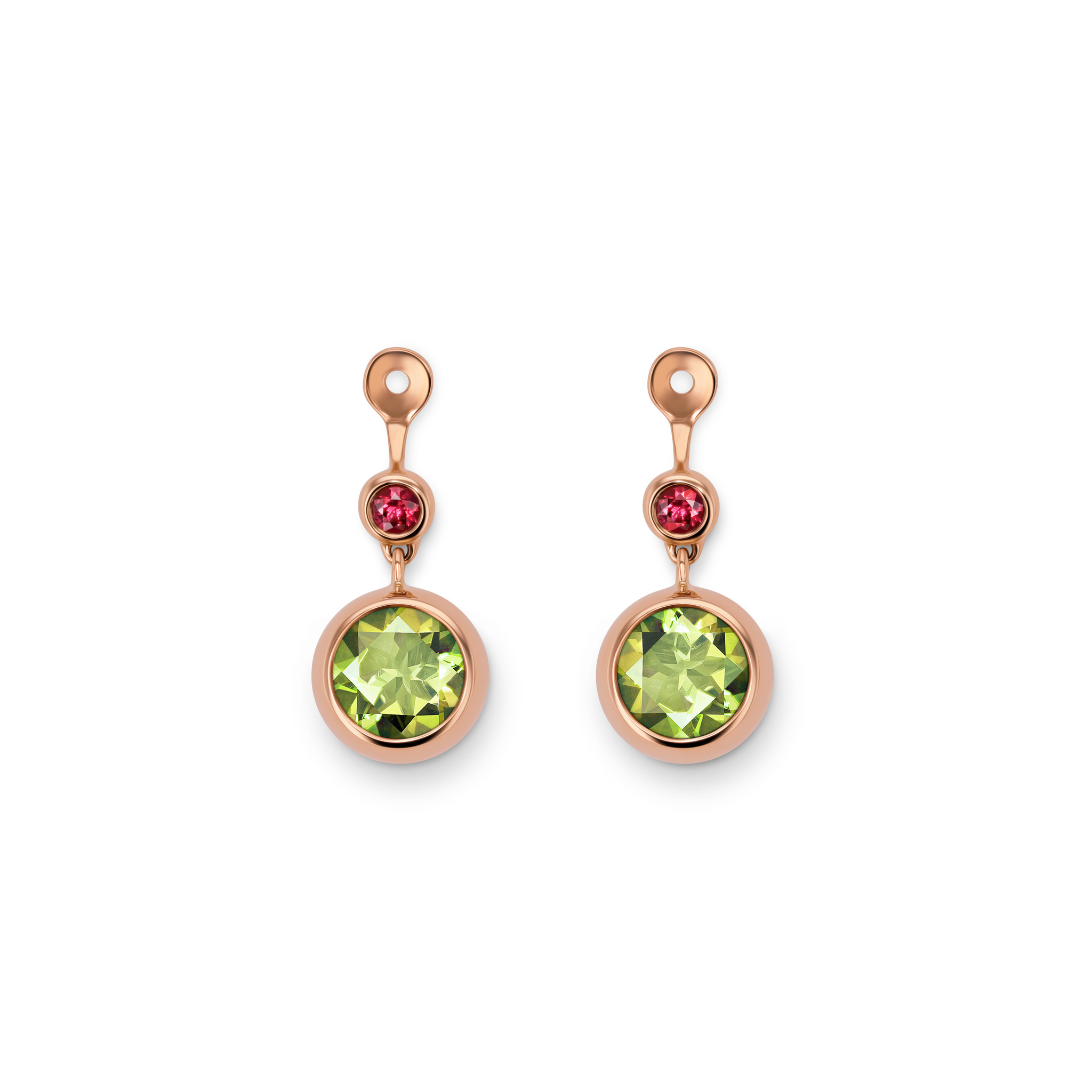 Earring pendants in red gold with two green round tourmalines totalling 1.57 ct. The pendants can only be worn with Sparks of Fire stud pierced earrings.
