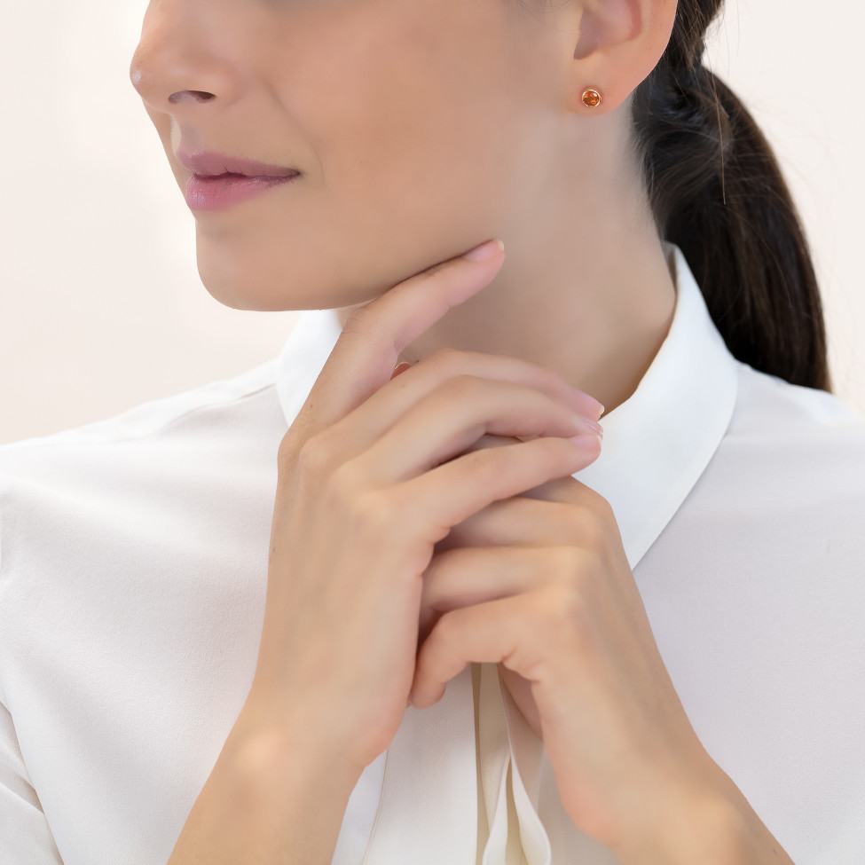 Red gold earstuds with two orange round mandarine garnets totalling 1.43 ct.