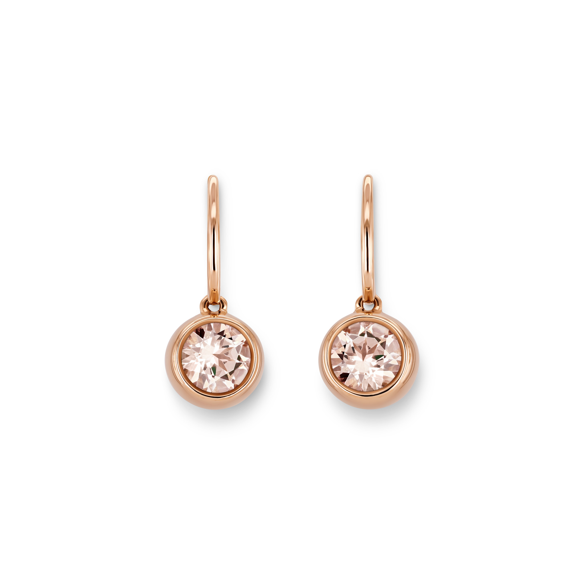 Red gold drop earrings with two pink round morganites totalling 1.51 ct.