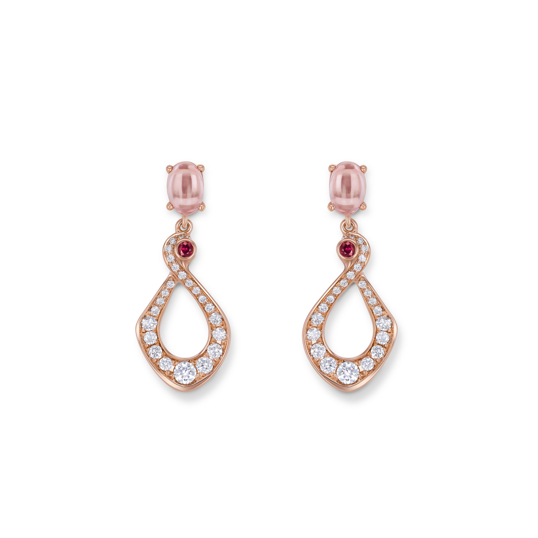 Red gold drop earrings with two light pink cabochon cut morganites, totalling 1.28 ct as well as 48 brilliant-cut diamonds totalling 0.49 ct.