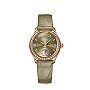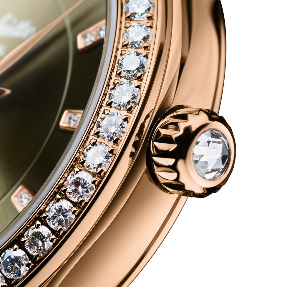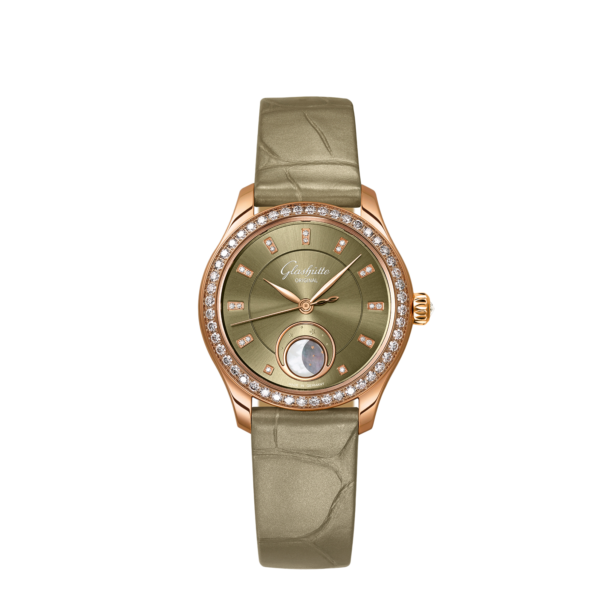This luxurious timepiece features an 18k red gold case beautifully paired with a green Louisiana alligator strap. The golden green sunray dial, enriched with diamonds, harmonizes with the rose-cut diamond on the crown, exemplifying opulence. The heart of this watch beats with the Caliber 35-14, viewable through the sapphire crystal case back, offering 60 hours of power reserve.