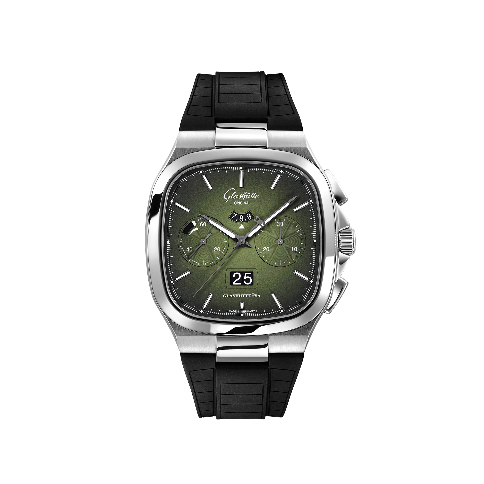 With the striking Seventies Chronograph Panorama, Glashütte Original introduces a distinctive timepiece reminiscent of the pulsating 1970s. The stainless steel case presents the "Fab Green" dégradé effect dial with rhodium-plated indices and hands, chronograph counters, a date aperture, and a power-reserve indication. The transparent case back reveals the automatic movement calibre 37-02. A black rubber strap with a folding clasp adds the finishing touch.