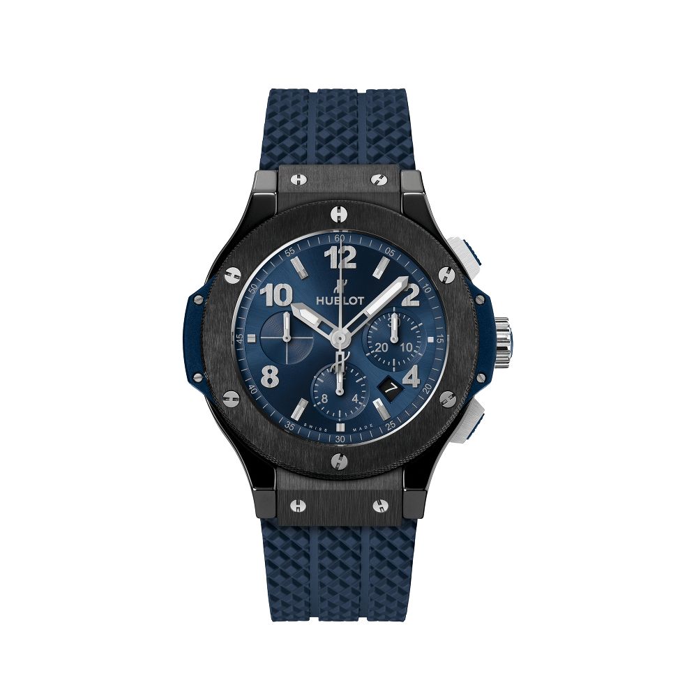 This Hublot chronograph features a 44mm polished and satin-finished black ceramic case, complemented by a vertically brushed black ceramic bezel with six H-shaped titanium screws. It has an anti-reflective sapphire crystal and a blue sunray satin-finished dial. Powered by the HUB4100 automatic chronograph movement, it has a 42-hour power reserve and is water-resistant to 100m.