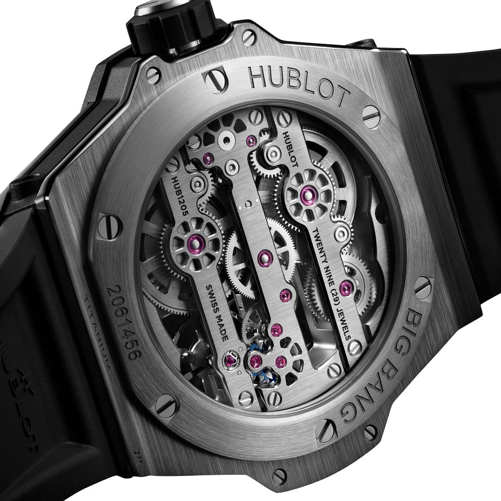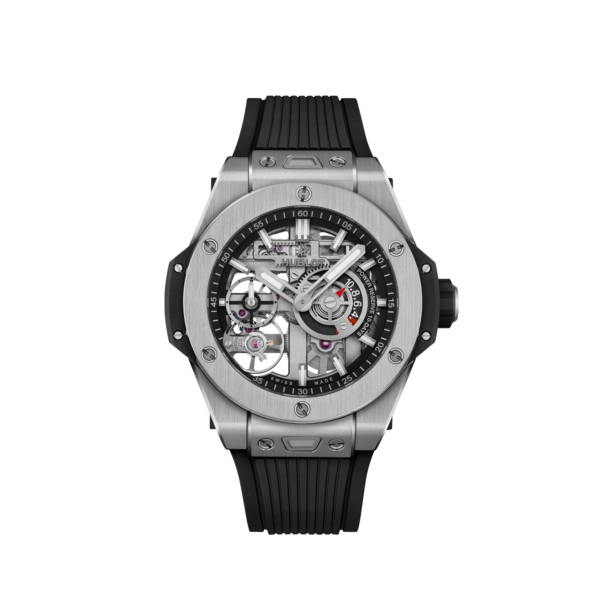 The Big Bang MECA-10 42 mm blends cutting-edge technology with avant-garde design. Its skeletonized MHUB1205 movement showcases intricate mechanics and a distinctive rack-and-pinion power reserve display. The 42 mm case, crafted from Grade 5 titanium, ensures exceptional lightness and durability. A true icon of modern watchmaking.