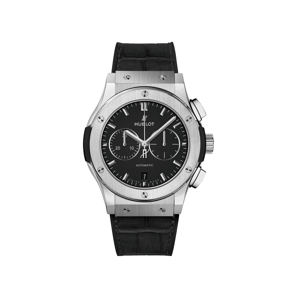 As part of the Hublot Classic Fusion collection, the Chronograph features a polished satin-finished 42 mm titanium case. The brushed bezel is fixed into place by six signature H-shaped titanium screws. The matt black dial presents white, luminescent indices and hands as well as three counters. The HUB1153 self-winding movement powers this timepiece. A black rubber strap with a stainless steel deployment clasp adds the finishing touch to this watch.
