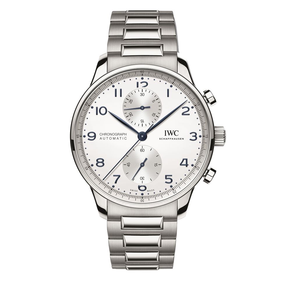 With this version of the Portugieser Chronograph, IWC Schaffhausen gives the family a sportier expression. The 41 mm stainless steel case presents the silver-plated dial with blue appliques and hands, the watch also offers displays for the chronograph seconds, and stopwatch functions for minutes and seconds. Visible through the sapphire case back, the self-winding calibre 69355 powers this timepiece. A stainless steel link bracelet with a butterfly folding clasp adds the finishing touch.
