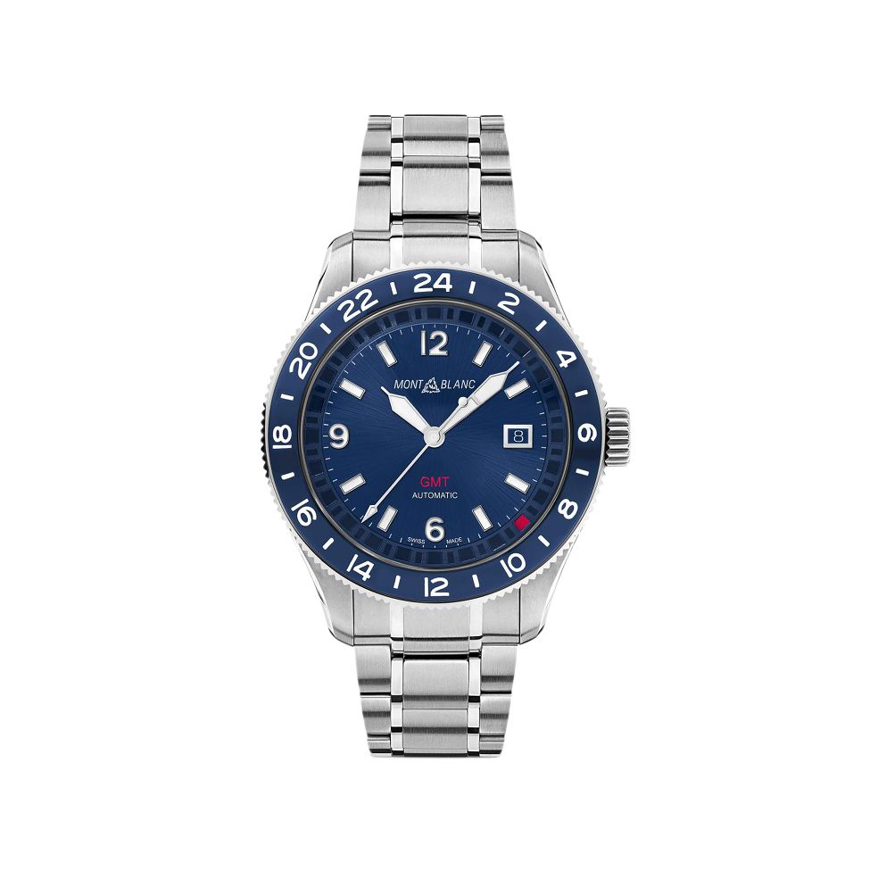The Montblanc 1858 GMT differs from typical GMT watches by displaying a second time zone without an additional hand. The second time zone is shown with a red square that moves around the outside of the dial and indicates the half hours at a time. The watch has a 42 mm stainless steel case with a blue anodised aluminium bezel and presents the blue sunburst dial with a date display at three o'clock. The case back is engraved with the continents, oceans, and names of cities in each of the 24 time zones, offering a worldtime indication. Powered by an automatic movement, this timepiece offers a power reserve of 50 hours. A slim stainless steel bracelet with fine adjustment for precision fitting adds the finishing touch to the watch.