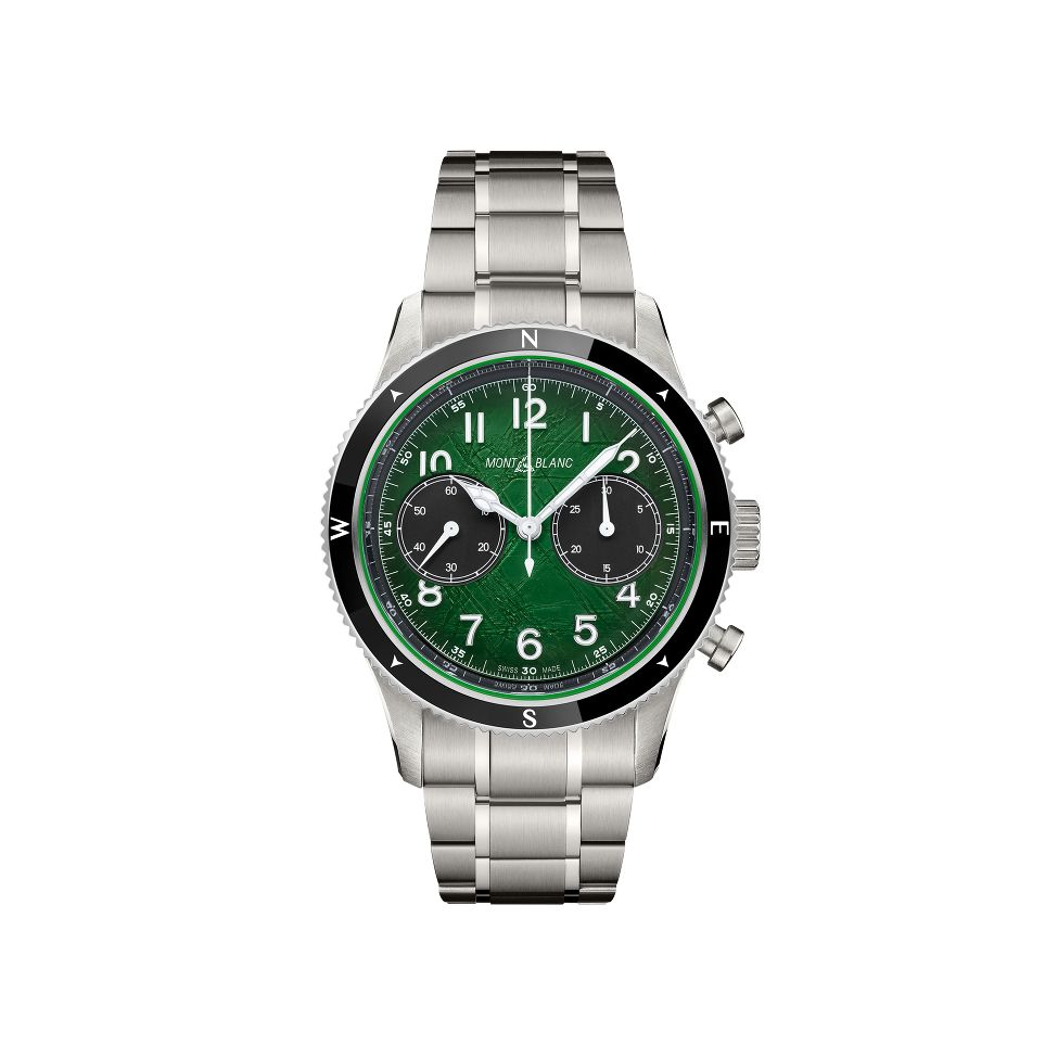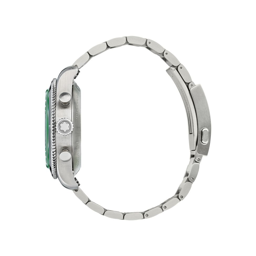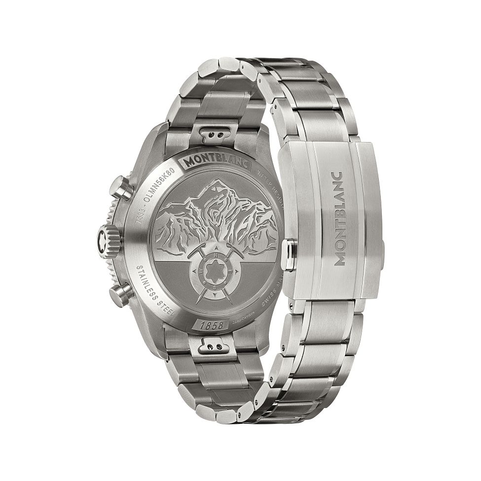 Inspired by jade icebergs, the Montblanc 1858 Automatic Date 0 Oxygen features a green glacier dial in a 41 mm oxygen-free steel case. It includes a fixed black ceramic bezel with luminous markers, an engraved case back reading "Spirit of Exploration", and a tapered, adjustable steel bracelet.