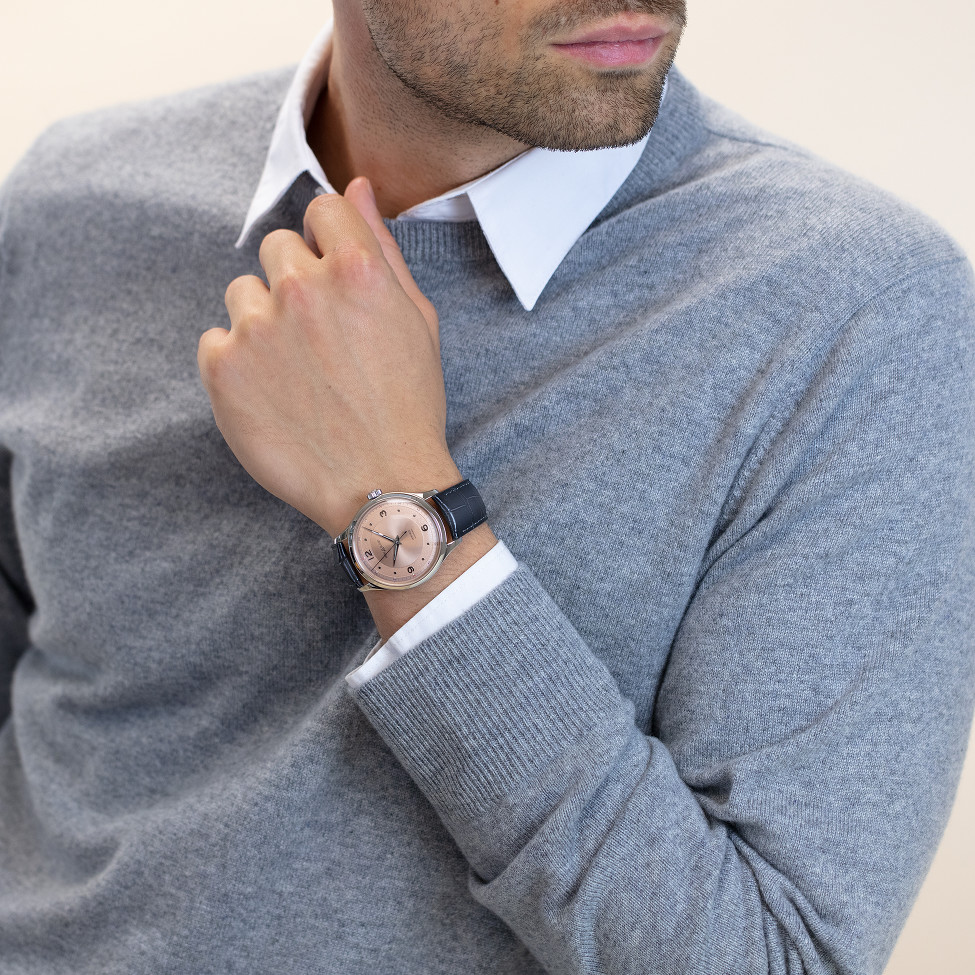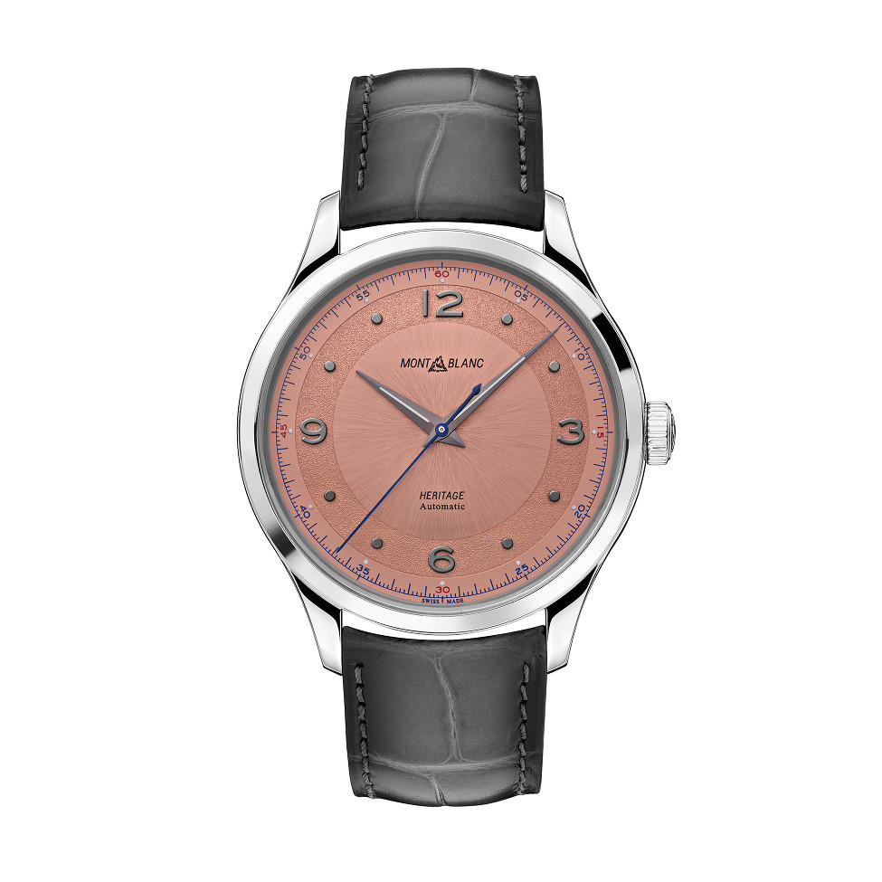 For the Montblanc Heritage Automatic, the Maison was inspired by the elegant Minerva classics dating back to the 1940s and 50s. The stainless steel case presents the salmon-coloured dial with anthracite Arabic numerals, indices and hands and a blued seconds hand. The indices are presented on a grained ring. Powered by the calibre MB 24.26, this watch offers a power reserve of 38 hours. A grey alligator leather strap with a stainless steel pin buckle completes this Swiss Made timepiece.