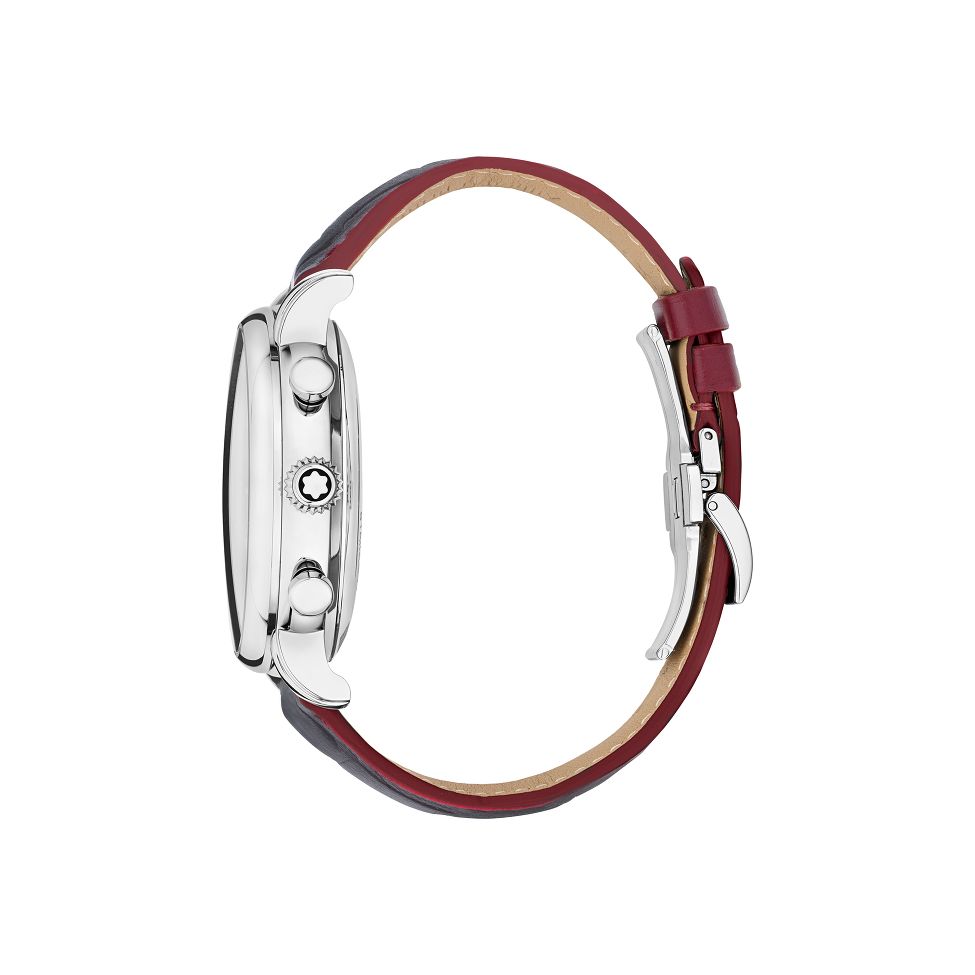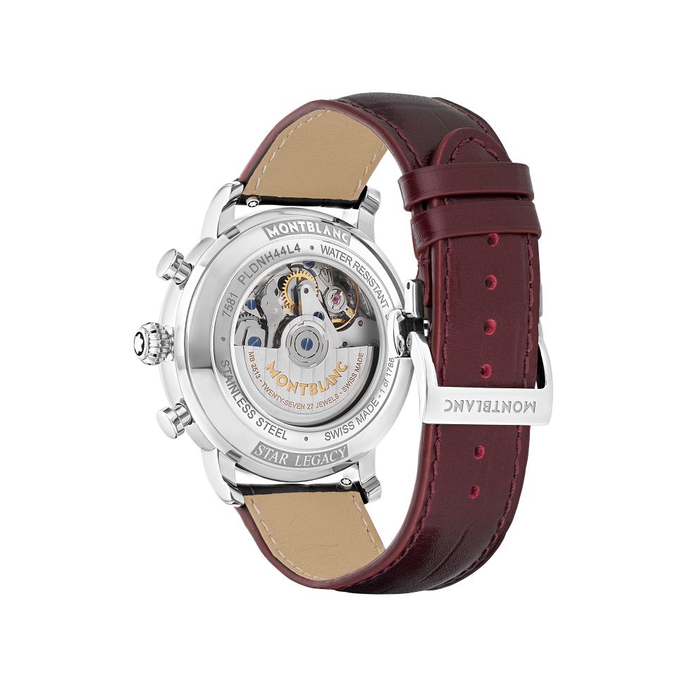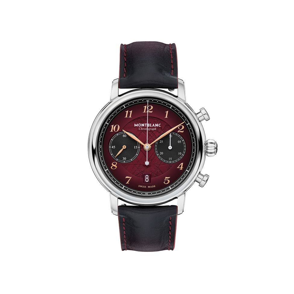 The Montblanc Star Legacy Chronograph Limited Edition of 1786 pieces pays tribute to Jacques Balmat, the first to summit Mont Blanc in 1786. It features a 42 mm stainless steel case housing a burgundy glacier-patterned dial with a sfumato effect, rose gold-coated numerals, and a 30-minute chronograph counter. Powered by the MB 24.31 automatic movement, it offers a 48-hour power reserve.