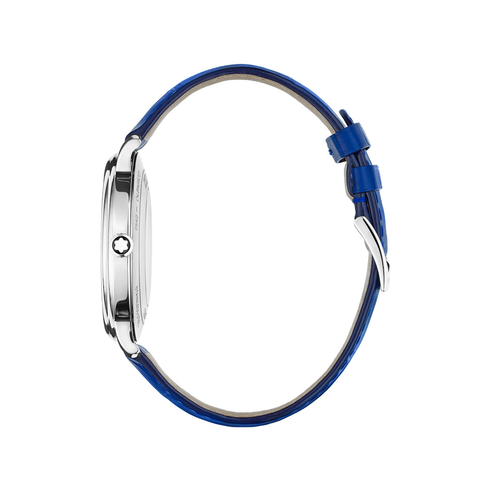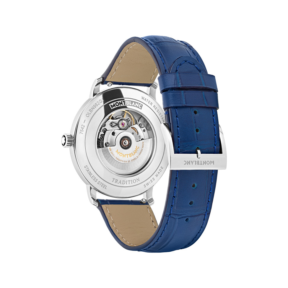 The Montblanc Tradition Automatic Date features a 40 mm stainless steel case with straight horns and a double-shaped bezel. Its blue dial shows the Mont Blanc's topography, accented by silver Roman numerals and a bold "XII". Sword-shaped hands, a Montblanc-engraved crown, and an interchangeable blue calf leather strap enhance its refined, modern look.