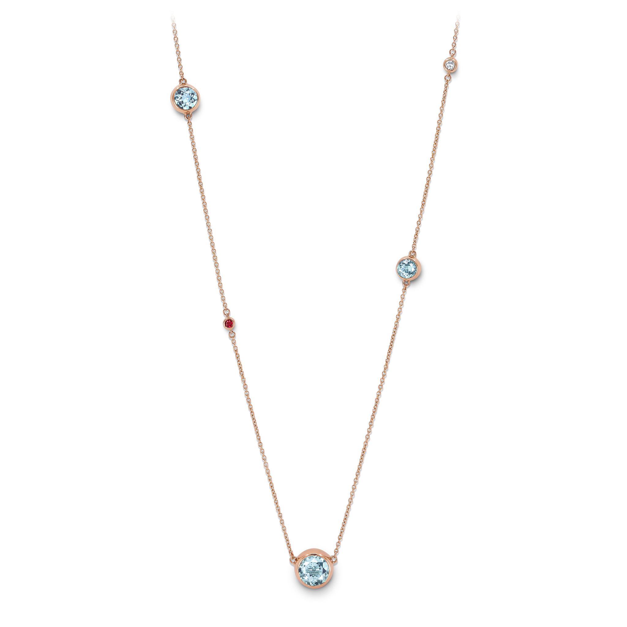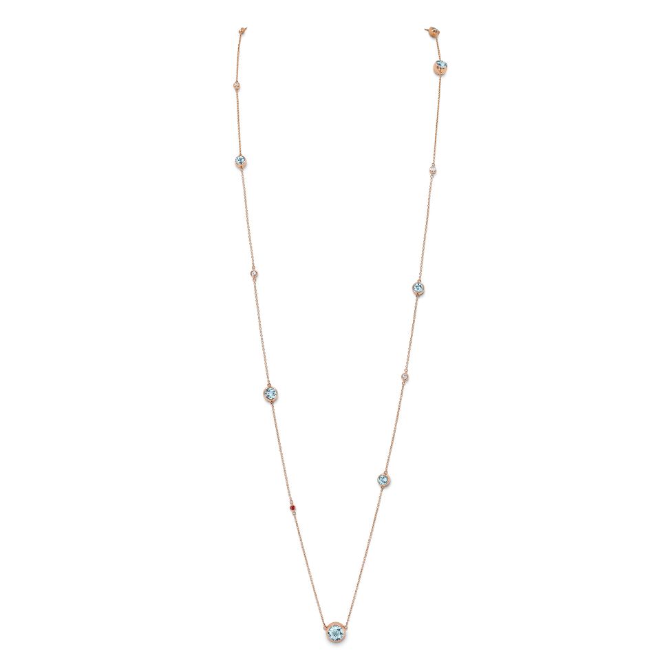 Rose gold necklace with eight light blue round aquamarines totalling 5.49 ct as well as four brilliant-cut diamonds totalling 0.25 ct.