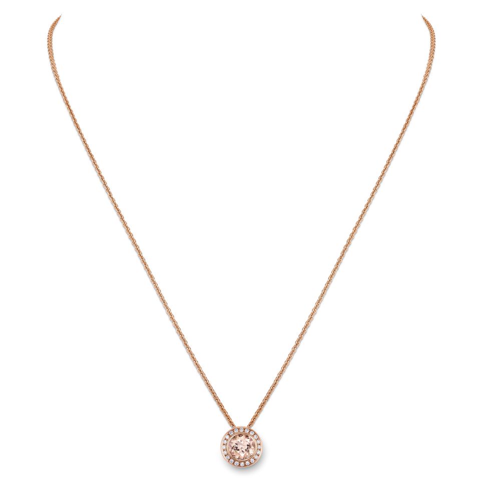 Necklace in rose gold with a round pink morganite, 0.65 ct, and 20 brilliant-cut diamonds totalling 0.07 ct.