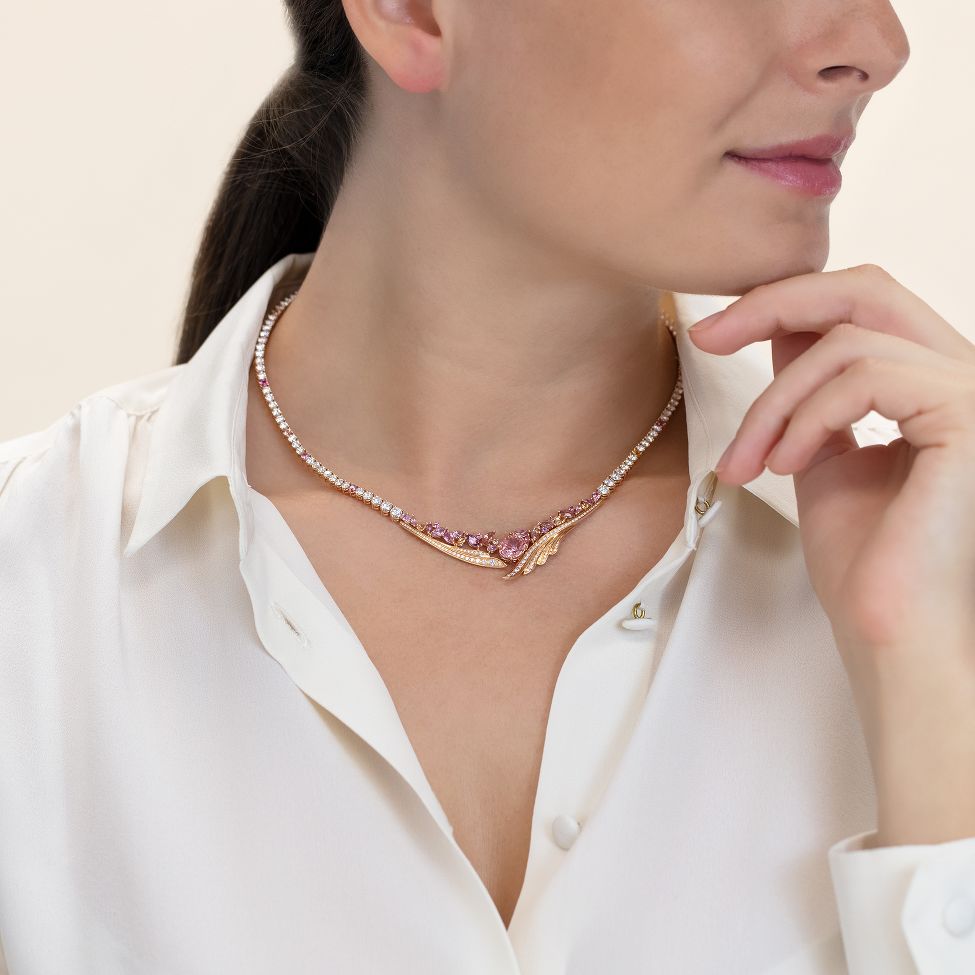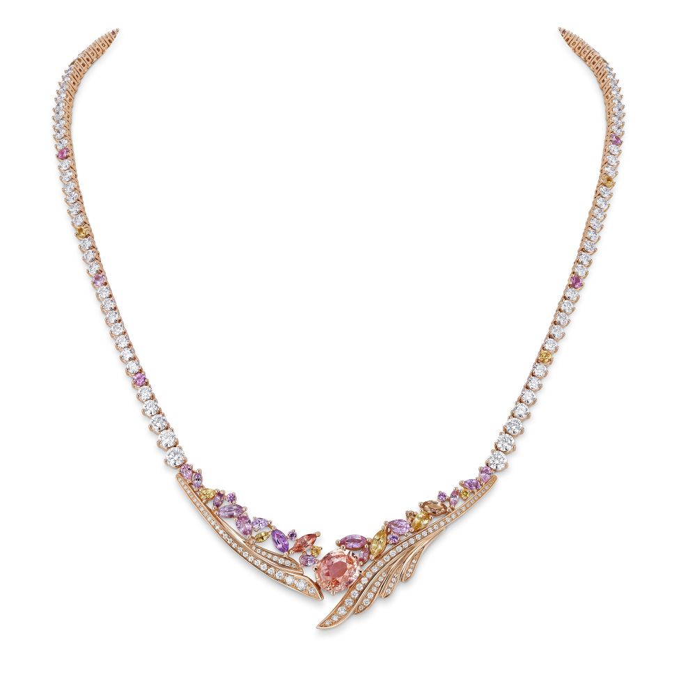Red gold necklace with a pinkish-orange oval padparadscha sapphire from Sri Lanka, 2.98 ct, 22 multicolour round sapphires totalling 1.32 ct, nine multicolour pear-shape sapphires totalling 1.02 ct, eleven multicolour marquise-shape sapphires totalling 1.39 ct as well as 188 brilliant-cut diamonds totalling 7.39 ct. As all padparadscha sapphires which are set in Gübelin Jewellery creations, the centre stone of this jewel is not heat treated.