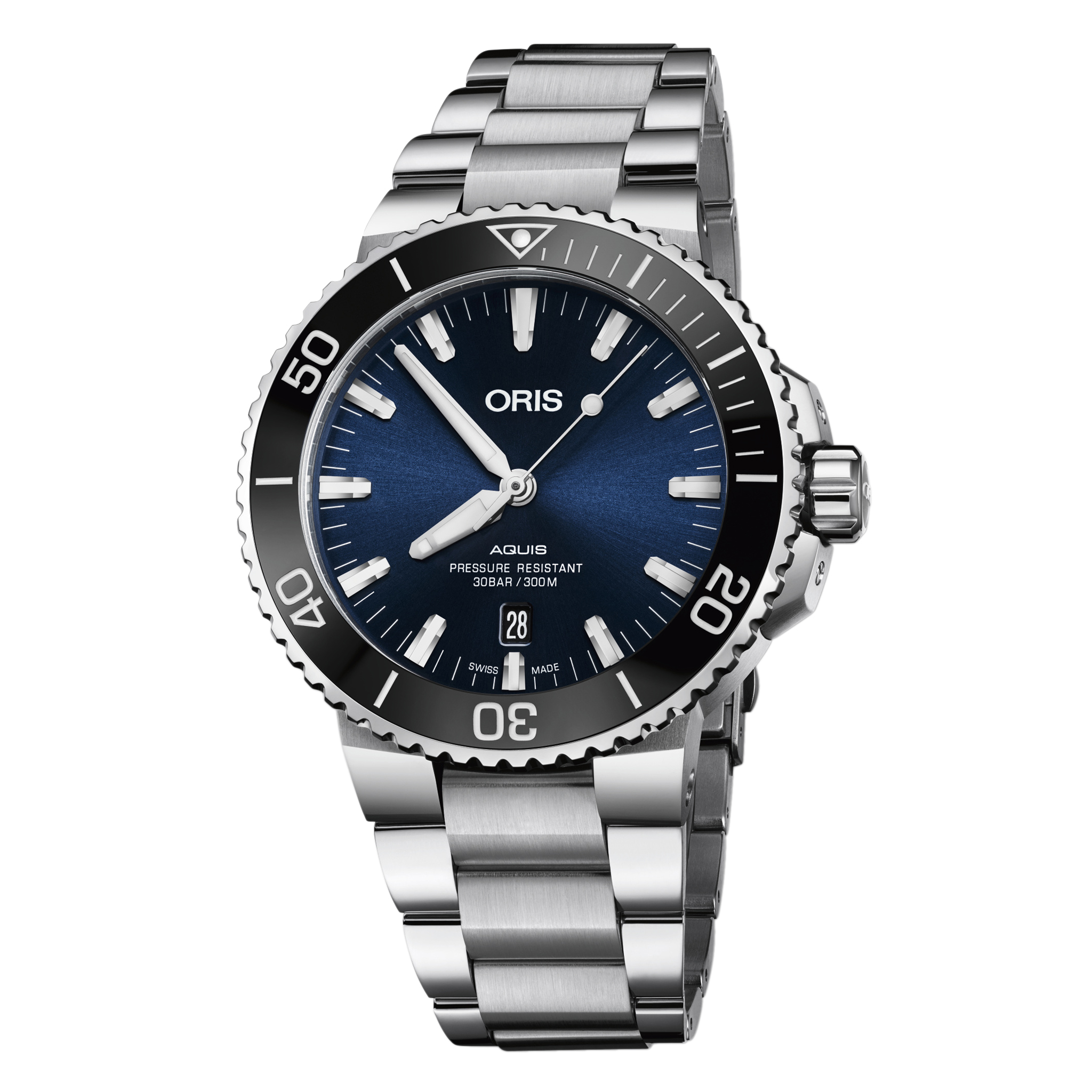 With the Aquis Date, Oris presents a timepiece that makes just as good a companion for the urban jungle as it will deep beneath the waves. The 43.5 mm stainless steel case is fitted with a black bezel with a minute scale. It surrounds the blue dial with a date aperture, hands and indices are coated with SuperLuminova. The timepiece is powered by the automatic calibre Oris 733, visible through the transparent case back. A stainless steel link bracelet with a folding clasp adds the finishing touch.