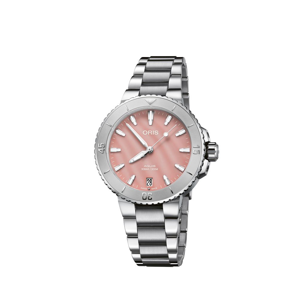 The Oris Aquis Date combines elegance and functionality in an impressive ladies' diver's watch design. The 36.5 mm stainless steel case, topped with a unidirectional rotating bezel and sapphire crystal, guarantees water resistance up to 300 metres. The pink mother-of-pearl dial with luminous hands and hour markers also features a date display in addition to hours, minutes and seconds. The watch is powered by the automatic Oris 733 calibre with a power reserve of 38 hours.