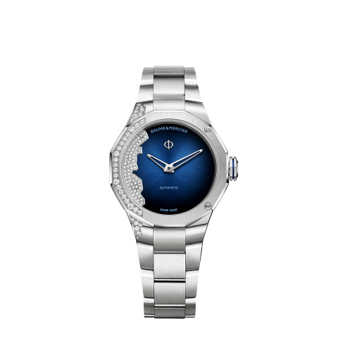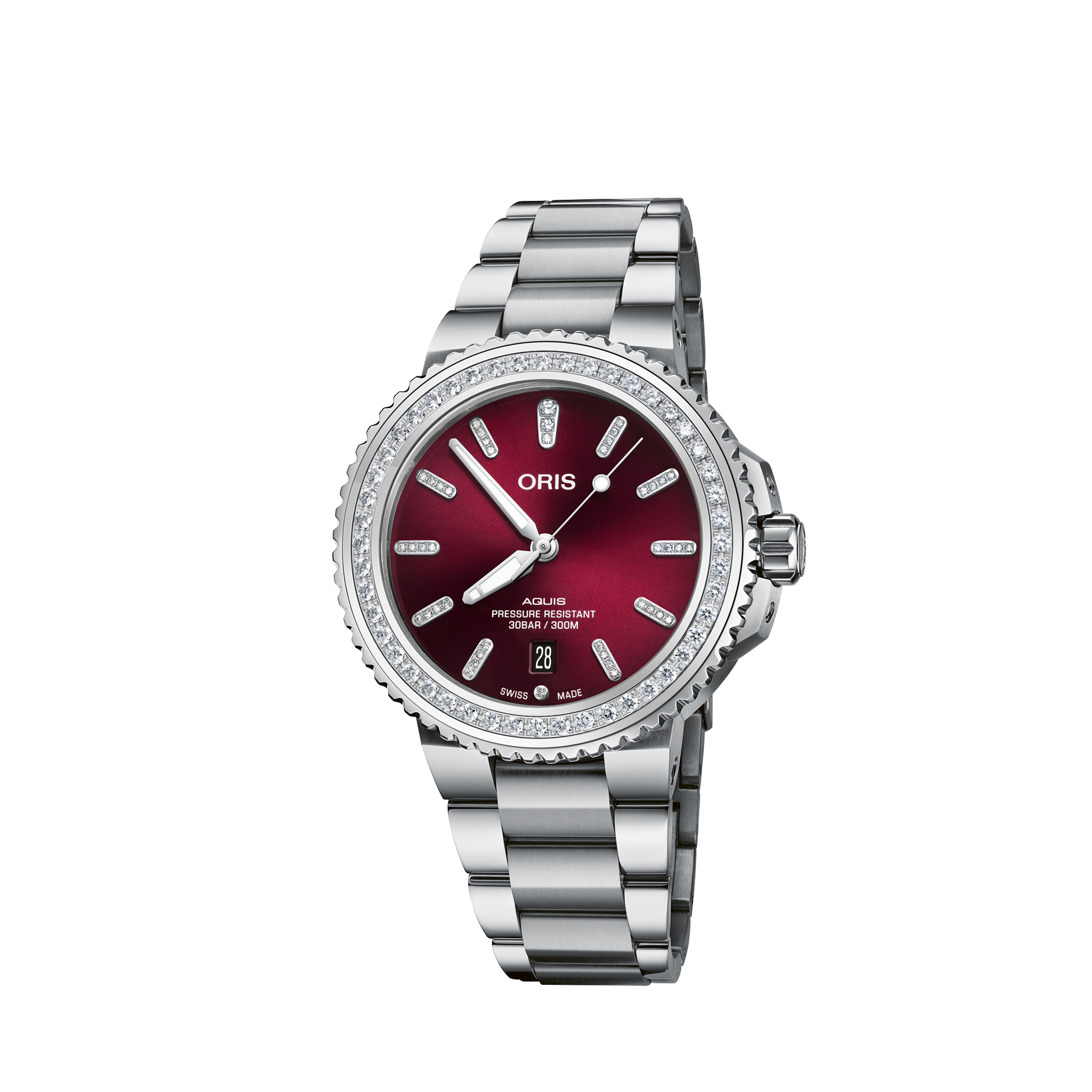 The Oris Aquis Date Diamonds enchants with its 41.5 mm stainless steel case set with 48 sparkling Top Wesselton VVS diamonds. The striking red dial, protected by a domed sapphire crystal with anti-reflective coating on both sides, emphasises the elegance of this watch. Equipped with the automatic Oris 733 calibre, it offers a power reserve of 38 hours and is water-resistant to 300 metres. A stainless steel bracelet rounds off the luxurious design.