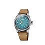 The watch combines sustainability with elegant aesthetics. It has a 38 mm stainless steel case and is water-resistant to 5 bar. The blue dial gradient and the luminous hands and hour markers give it a striking design. The calibre 754 automatic movement has a power reserve of around 38 hours. A special feature is the strap made from sustainably sourced deerskin, manufactured by Cervo Volante. The movement is visible through the transparent case back and, together with the leather strap, offers a natural and sophisticated look.