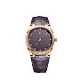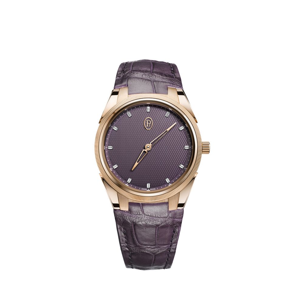 With the Tonda PF Automatic, Parmigiani Fleurier unveils a timepiece of aesthetic excellence. The rose gold case with a knurled bezel frames the deep ruby guilloché grain d'orge dial, adorned with rhodium-plated appliques set with 12 baguette diamonds and skeletonized delta-shaped hands. The watch is powered by the PF770 automatic movement, providing a power reserve of 60 hours, and is elegantly displayed through the transparent case back. A ruby-red alligator leather strap adds the perfect finishing touch.