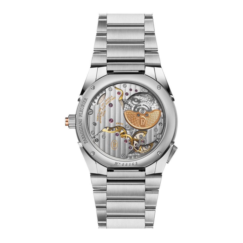 Crafted in steel and platinum, this 40 mm timepiece features a Verzasca-green dial with hand-guilloché "Grain d'Orge" finish. It is powered by the PF051 calibre with a 48-hour power reserve. Rhodium-plated gold markers and a sapphire case back complete the look.