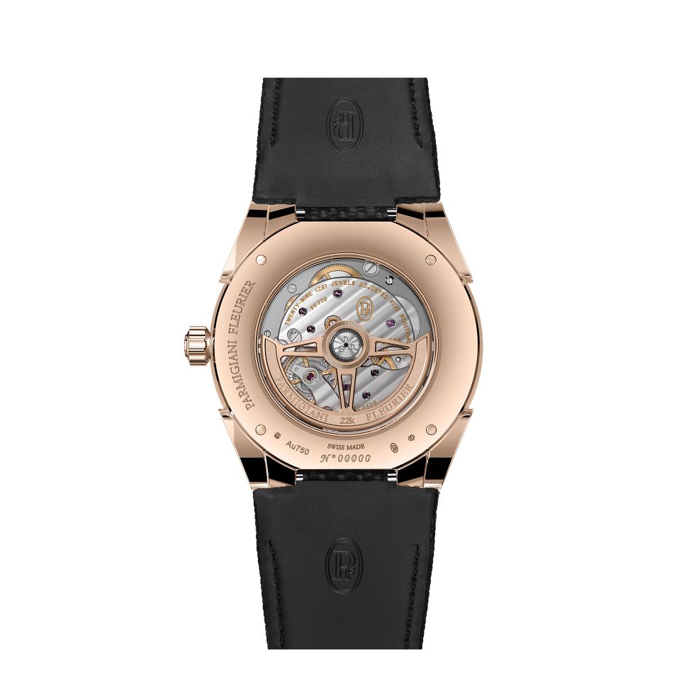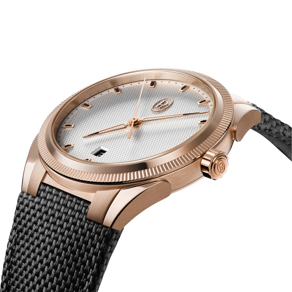 With the Tonda PF Sport Automatic, Parmigiani Fleurier presents a new line tailored for today's sporty lifestyle. The 41 mm rose gold case with a knurled bezel showcases the silver clou triangulaire guilloché dial adorned with hand-applied rose gold appliques and skeletonized delta-shaped hands, complementing the small date at 6 o'clock. The watch is powered by the PF770 automatic movement, featuring a newly designed oscillating weight inspired by the steering wheel of the Ferrari 250 GTO. The double-barrel manufacture movement is visible through the transparent case back and offers a power reserve of 60 hours. A black rubber strap with a textile-type texture adds the finishing touch.