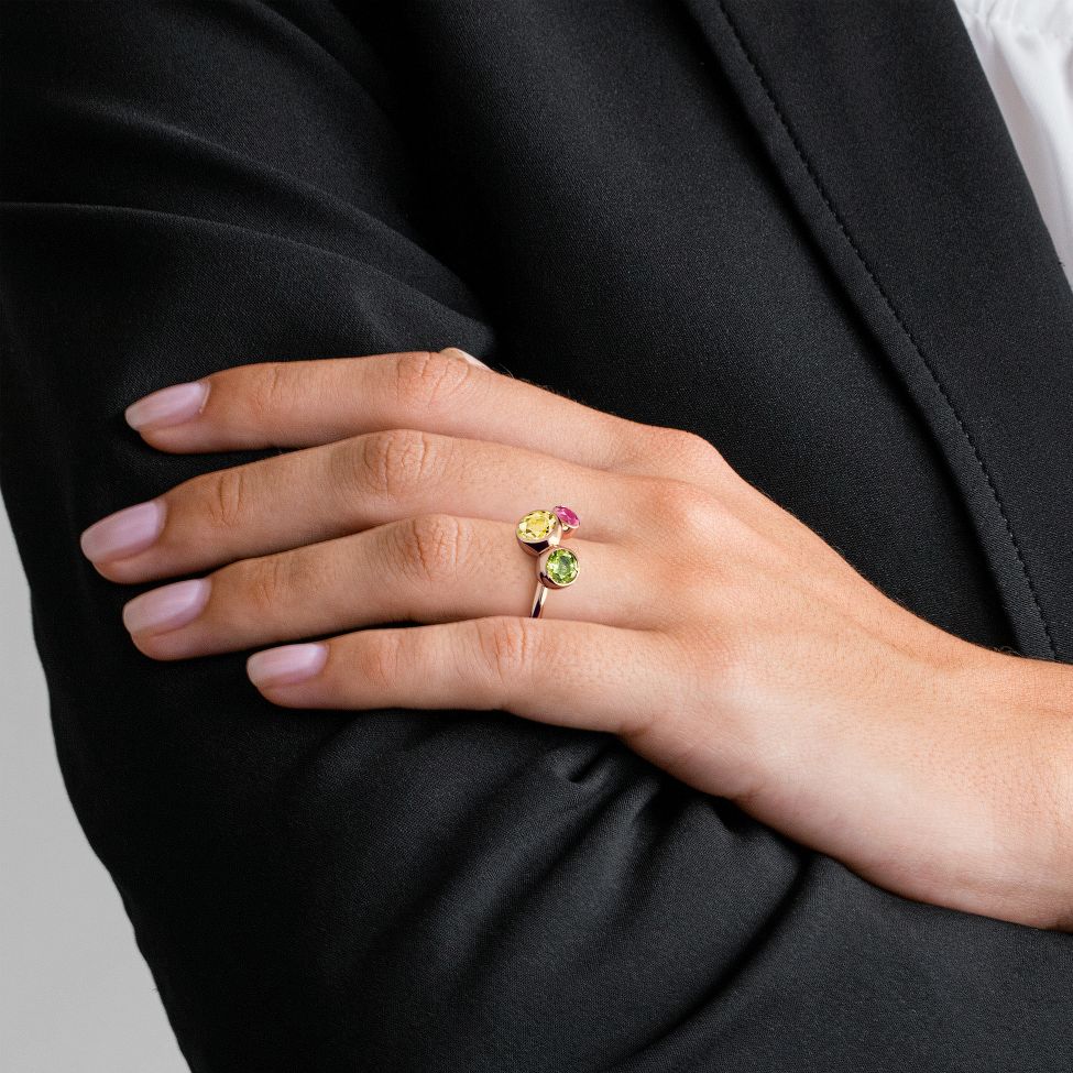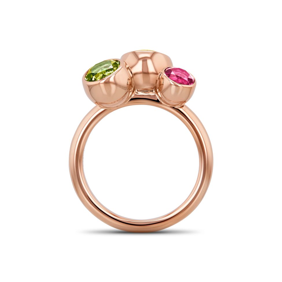 Red gold ring with a pink round tourmaline, 0.40 ct, a yellow round beryl, 1.10 ct and a green round peridot, 0.90 ct.