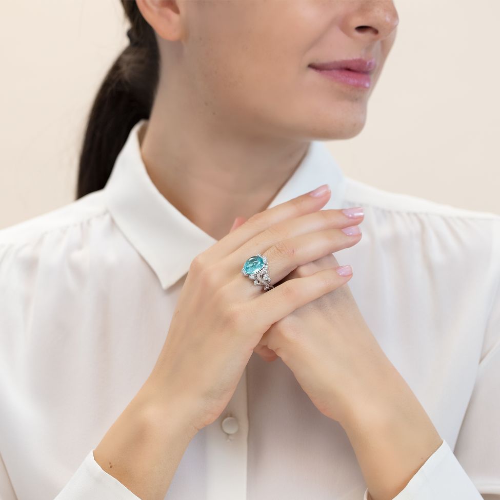 White gold ring with a green-blue cabochon-cut paraiba-tourmaline from Mozambique, 5.37 ct, as well as 133 brilliant-cut diamonds totalling 1.06 ct.