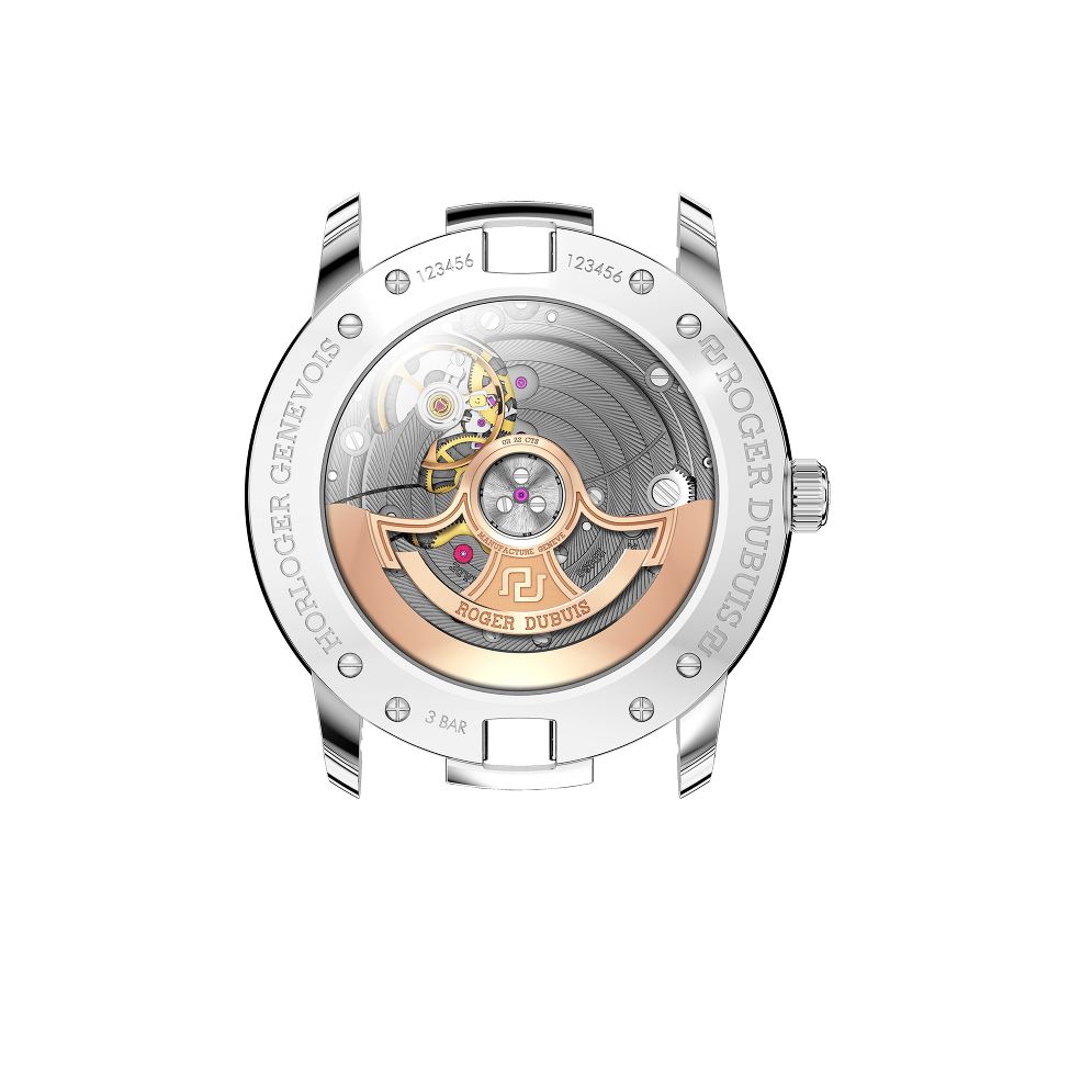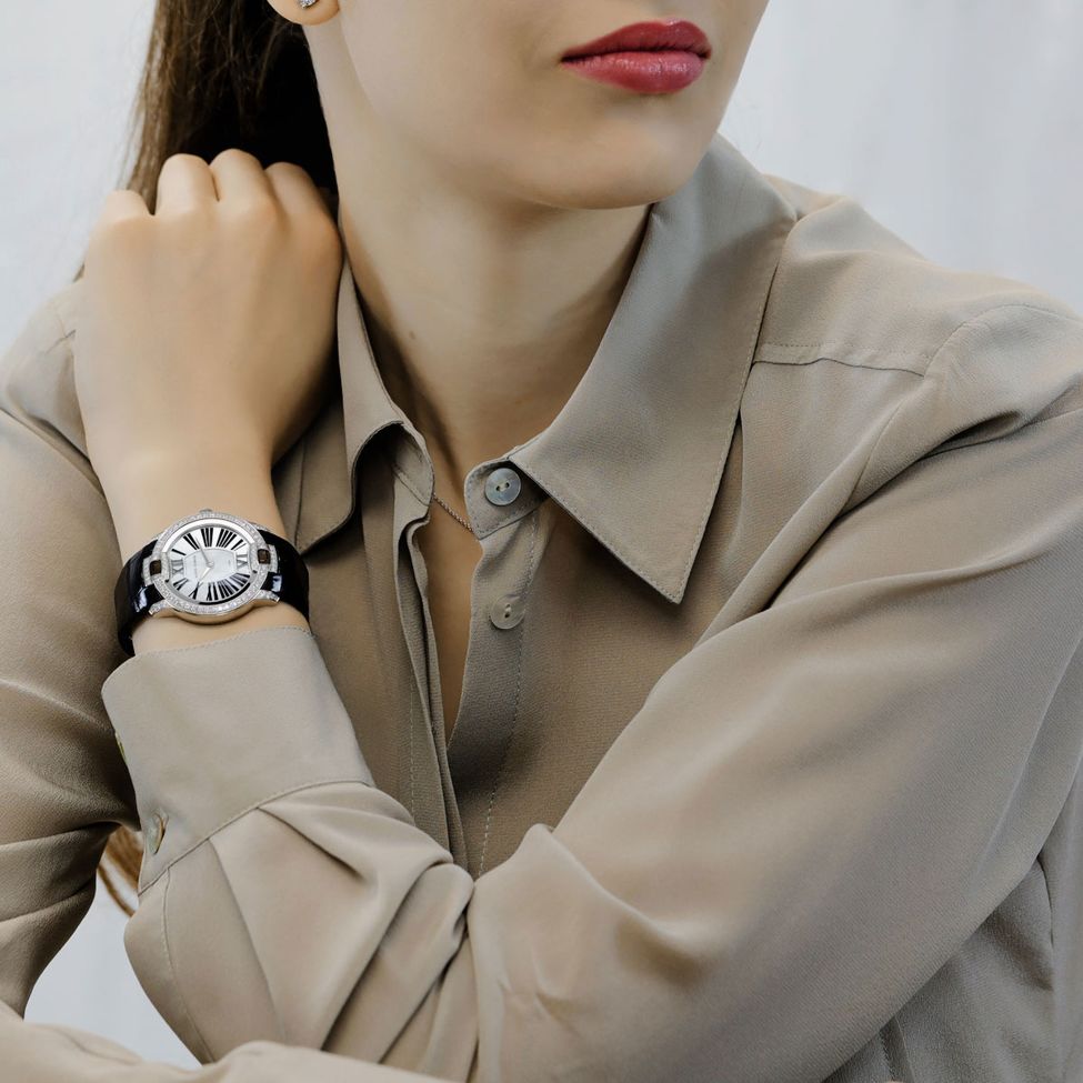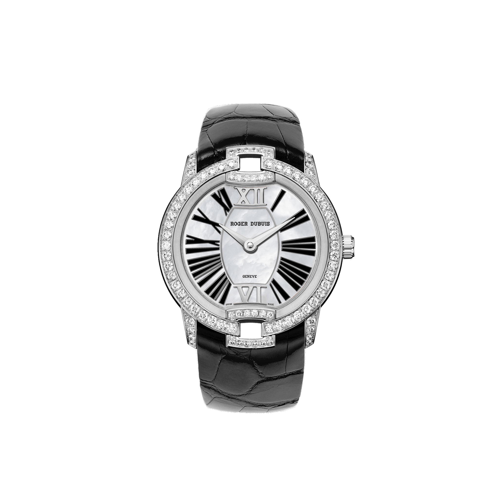 Velvet by Roger Dubuis merges haute joaillerie with finest watchmaking skills. The white gold case features a diamond set bezel and a white mother-of-pearl dial with black Roman indices. The transparent case back reveals the automatic calibre RD830 with a power reserve of 48 hours. A black alligator leather strap with a diamond-set, white gold buckle adds the finishing touch.
