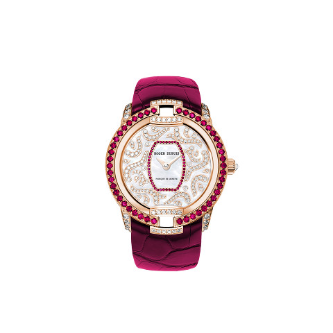 The unique spirit of Roger Dubuis shines brightly in the contemporary and seductive Velvet Blossom. The white gold case features a diamond set bezel. The white mother-of-pearl dial has flowers and leaves sculpted of Grand Feu enamel in matching colours and set with a brillliant-cut diamond in each flower. This model is a limited edition of 28 pieces with a numbered engraving on the back of each watch. The watch is powered by the Automatic self-winding RD821 movement it offers a power reserve of 48 hours. A red satin finish strap with white gold adjustable folding buckle, set with brilliant cut diamonds, adds the finishing touch.