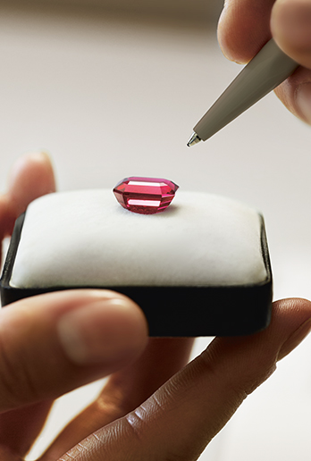 White gold ring with a cushion-shape ruby from Mozambique, 1.46 ct, as well as 22 brilliant-cut diamonds totalling 0.11 ct.