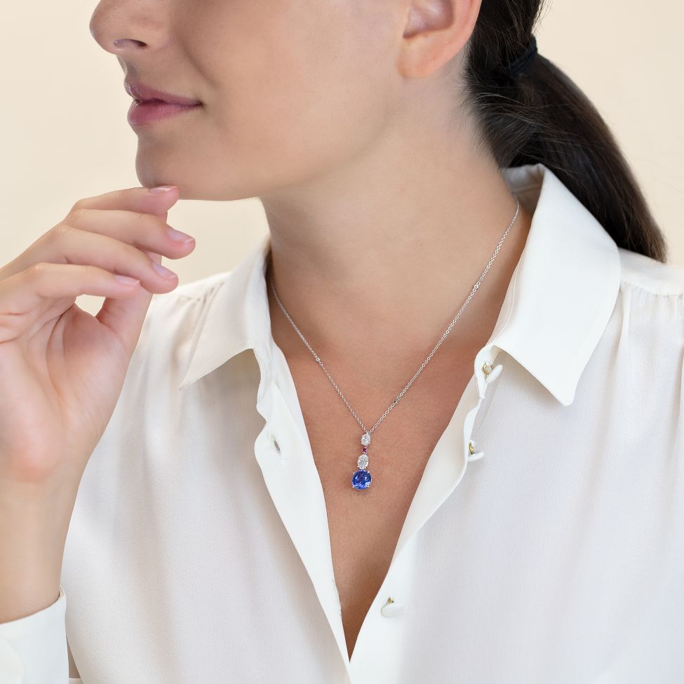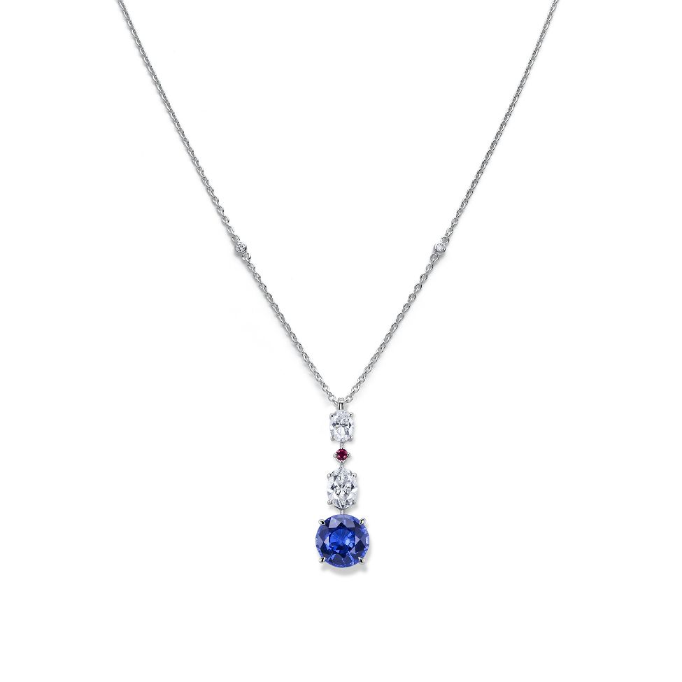 White gold necklace with a round sapphire from Sri Lanka, 3.37 ct, two oval diamonds totalling 1.09 ct as well as six brilliant-cut diamonds, totalling 0.38 ct.