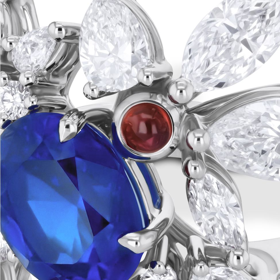 Ring aus Weissgold mit 1 ovalen blauen Saphir von 4.61 ct aus Burma, 3 Brillanten von zusammen 0.08 ct, 8 tropfenförmigen Diamanten von zusammen 1.08 ct und 5 marquise-förmigen Diamanten von zusammen 0.68 ct.