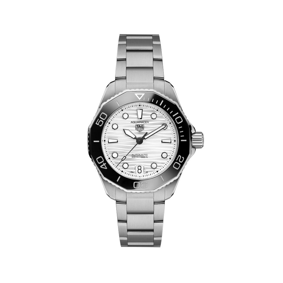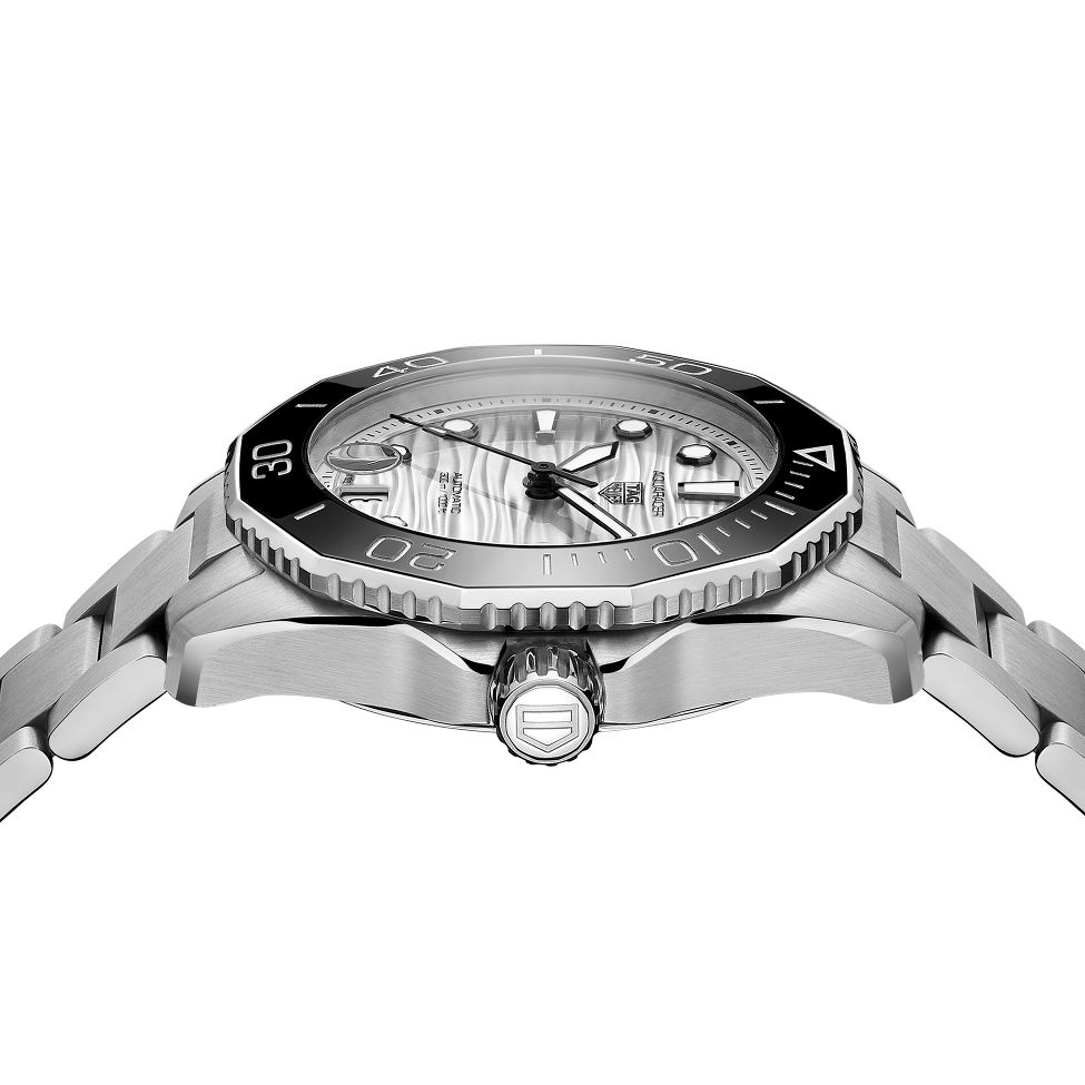 With the Aquaracer Professional 300 TAG Heuer presents the perfect diving companion. The polished and brushed steel case is fitted with a turning black ceramic bezel. On the silver-lacquered dial with a wavy finish, hand-applied luminescent indexes and hands are complemented by a date window located at six o'clock. This timepiece is powered by the automatic calibre 5, a brushed, adjustable stainless steel link bracelet with a folding clasp adds the finishing touch.