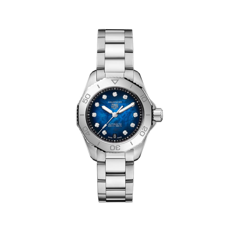 The TAG Heuer Aquaracer blends precise mechanics with a clean dive-inspired look. A stainless-steel case and bracelet deliver durability and comfort. Inside beats the self-winding Calibre 9. Diamond hour markers totaling approx. 0.11 ct add subtle sparkle and enhance legibility?a contemporary everyday watch made for life near the water.