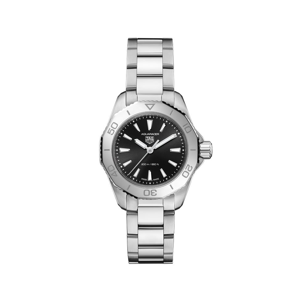 The TAG Heuer Aquaracer pairs precise mechanics with a maritime-inspired look. A finely finished stainless-steel case flows into the matching bracelet. Inside, the self-winding Calibre 9 delivers dependable performance. Diamond hour markers totaling approx. 0.11 ct add subtle radiance and aid legibility.