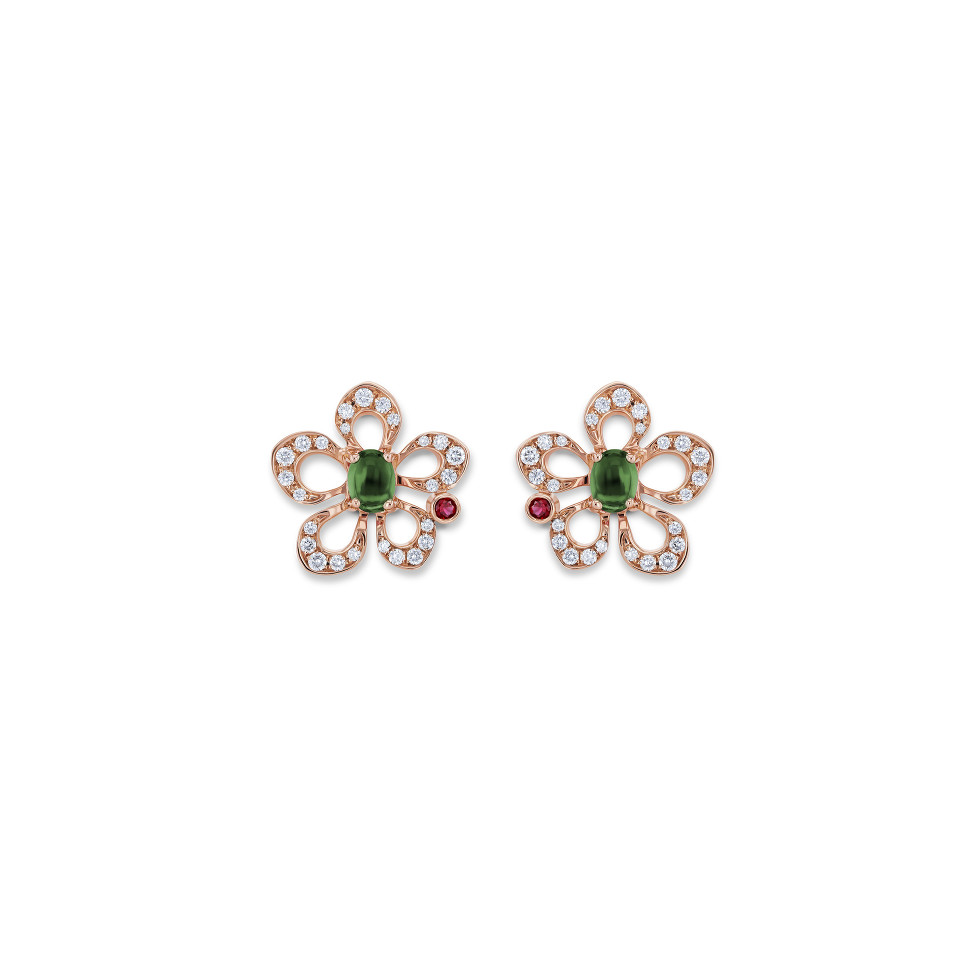 Red gold earrings with two green cabochon cut tourmalines, totalling 0.29 ct as well as 50 brilliant-cut diamonds totalling 0.23 ct.