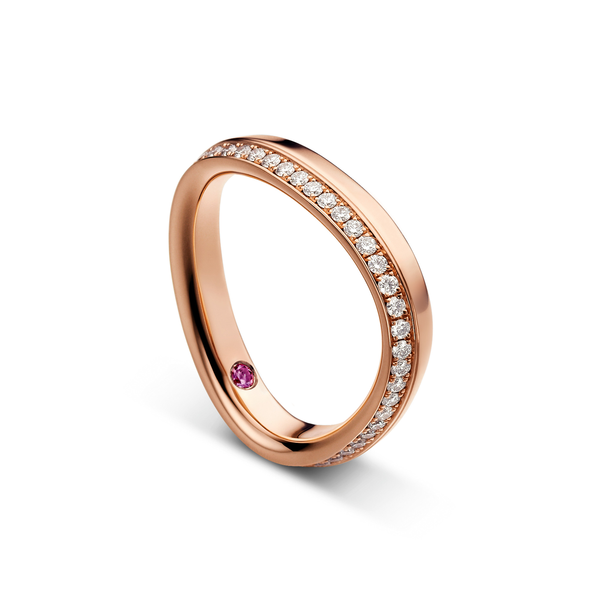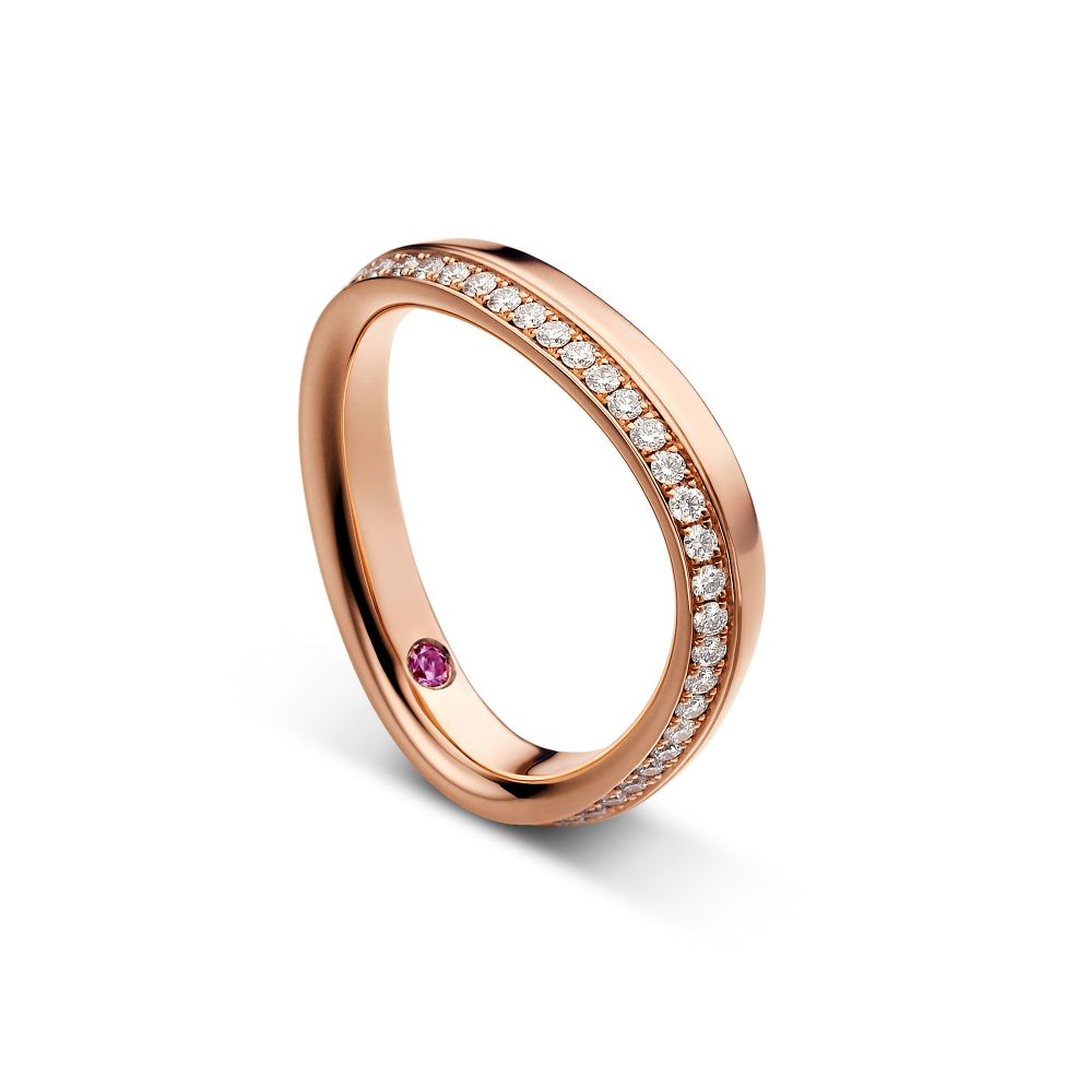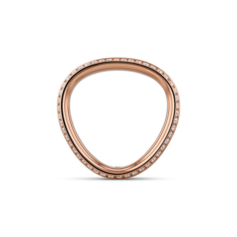 Heart-shape wedding band in red gold with brilliant-cut diamonds.