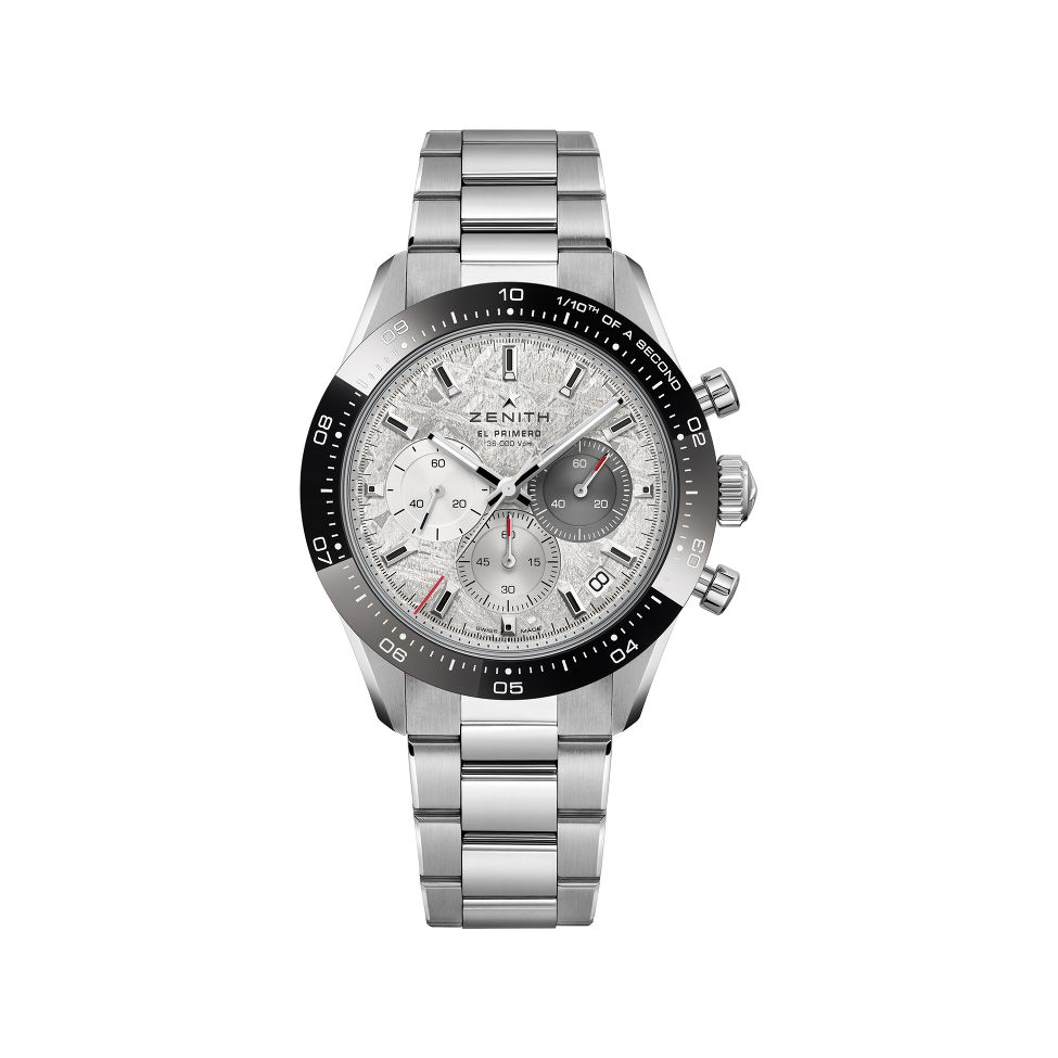 Zenith Chronomaster in stainless steel with matching bracelet. Automatic El Primero 3600 powers the chronograph for precise timing. Clean hands, applied markers, and brushed/polished contrasts deliver sharp legibility and a modern, sporty look.