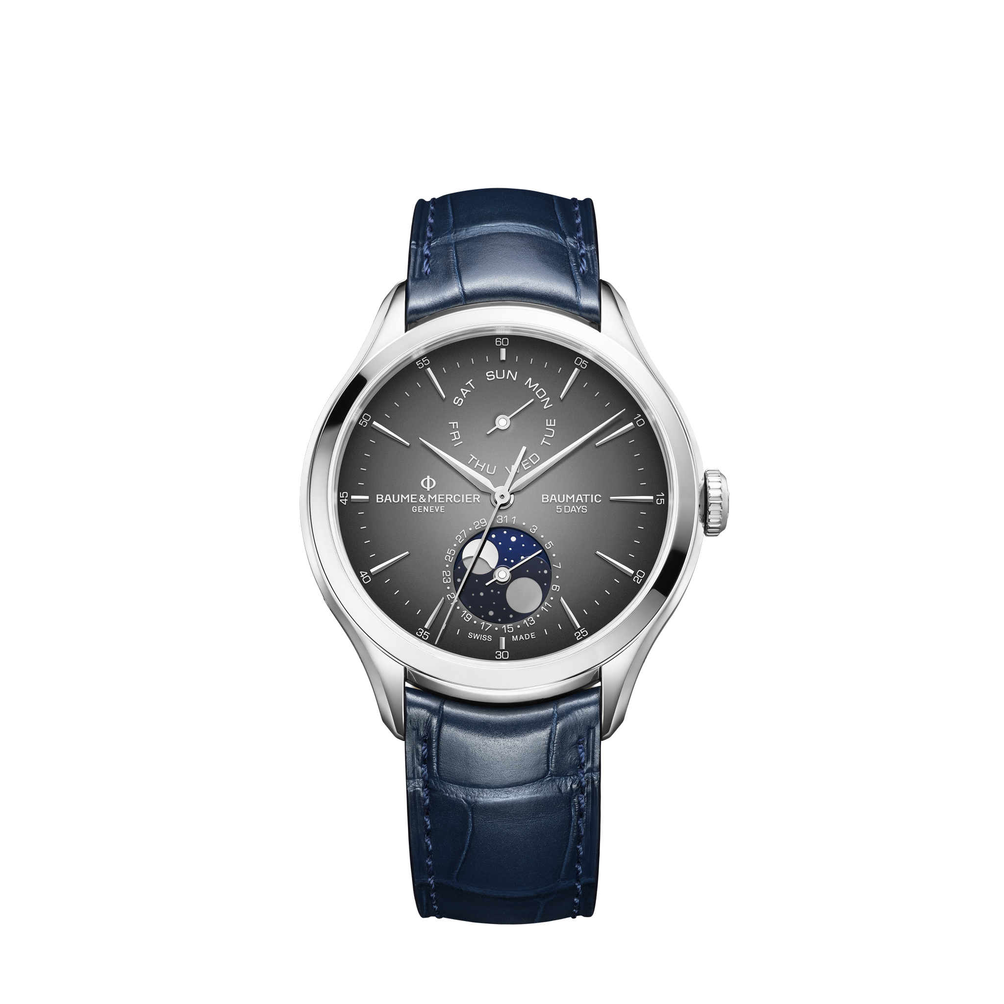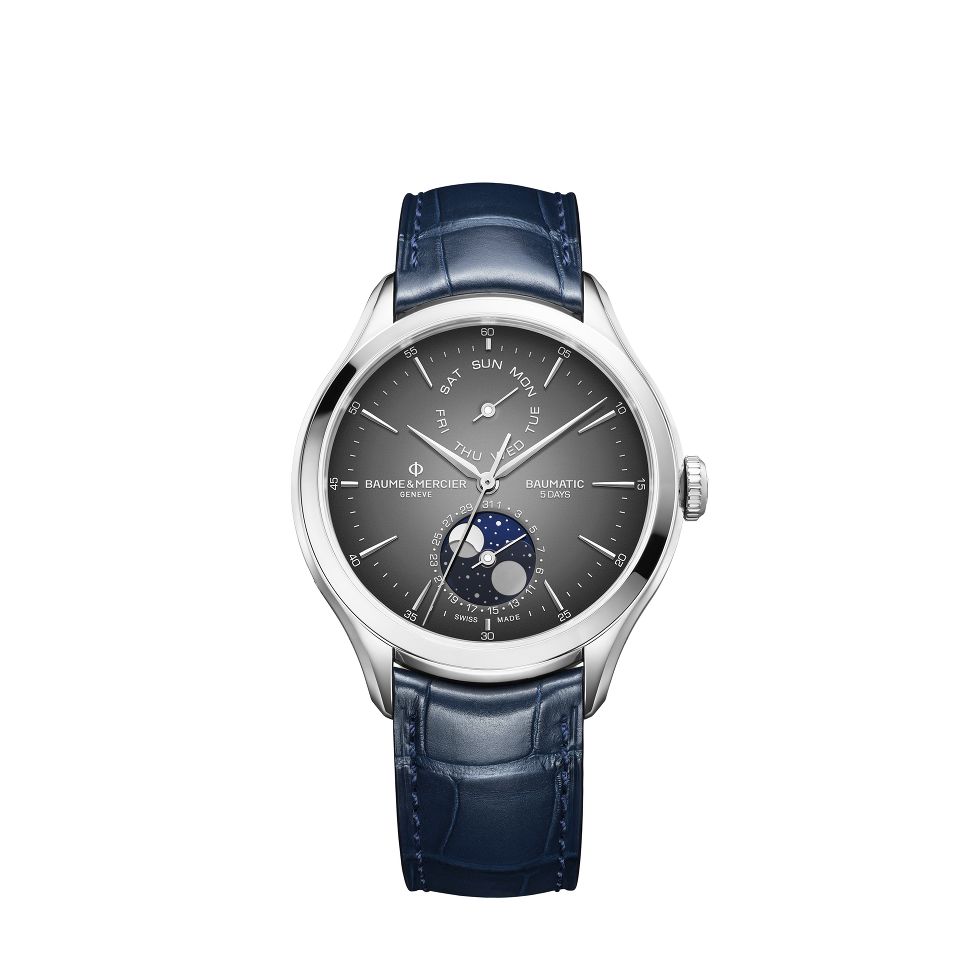 Clifton 10548 是一款自动腕表,具有星期、日期和月相功能。它结合了抛光不锈钢表壳、灰色漆面表盘和镀铑铆接时标。由内部自动机芯驱动,提供近乎完美的精准度。