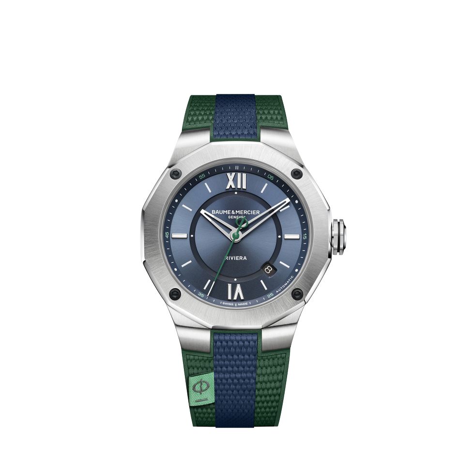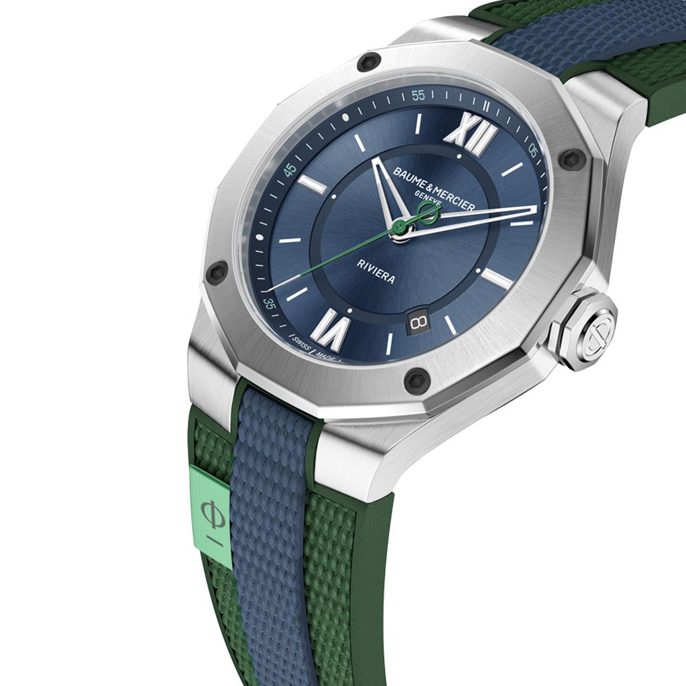 凭借 Riviera,名士表吸引了想要终极运动时尚腕表的顾客。 这款 Riviera 型号的 42 毫米精钢表壳令人着迷,该表壳具有引人注目的运动线条和在多个层面上具有蓝色旭日饰面的表盘。 该型号以其黑色 DLC 涂层钢螺丝从系列中脱颖而出,这些螺丝固定了一眼就能认出的十二边形表圈。 镀铑指针呈现镂空设计,秒针带有 Phi 符号,这是品牌明确无误的标志,作为配重。 日期显示位于四点钟和五点钟之间。 绿色和蓝色橡胶表带突显出特殊的双色调效果。 缝制的绿松石织物标签使手表更加完美。