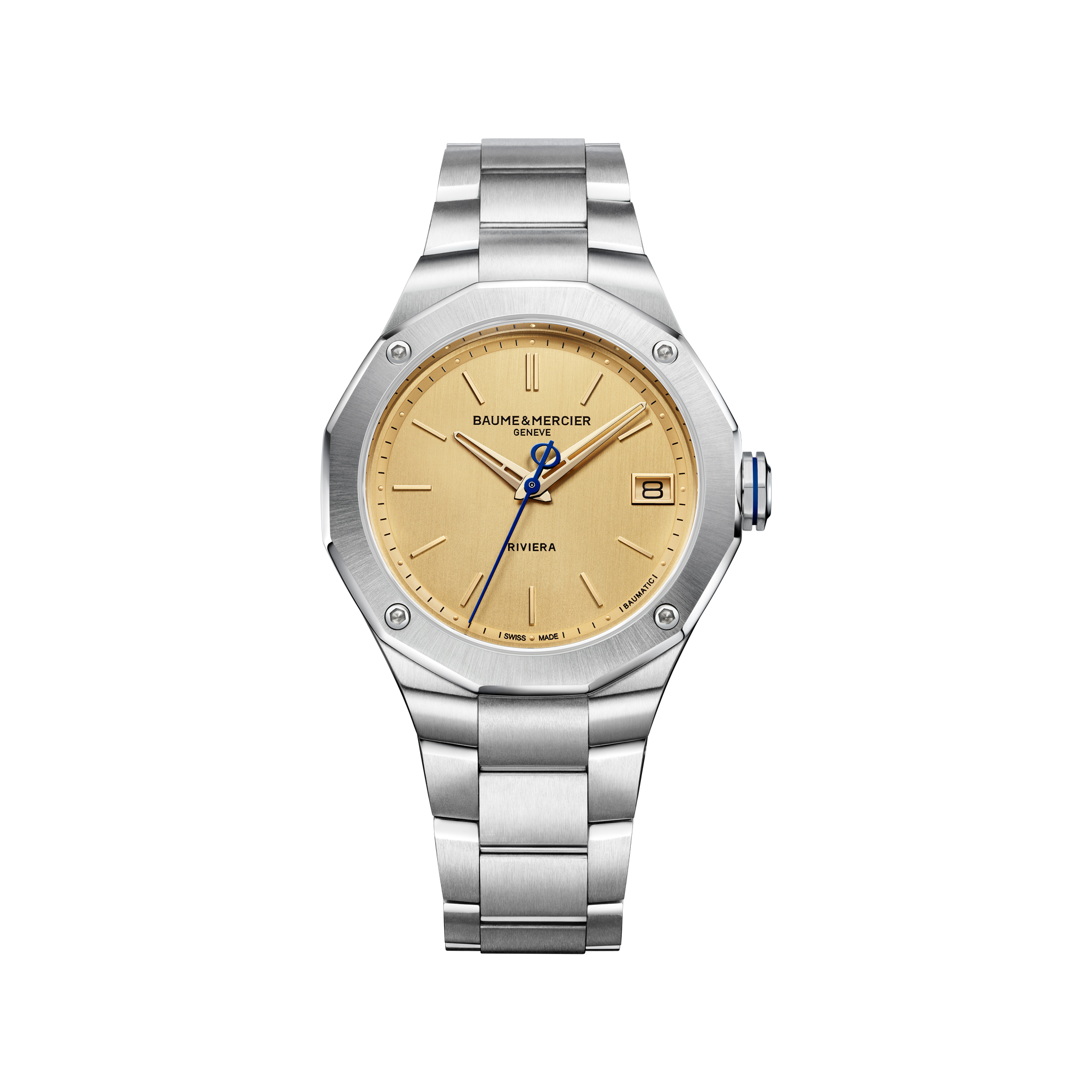 这款Riviera"特别版"腕表采用39毫米十二边形精钢表壳,搭配金色垂直拉丝表盘、大型日期窗与镂空指针。搭载品牌自制Baumatic机芯,动力储存达120小时,兼具制表精艺与运动风格。