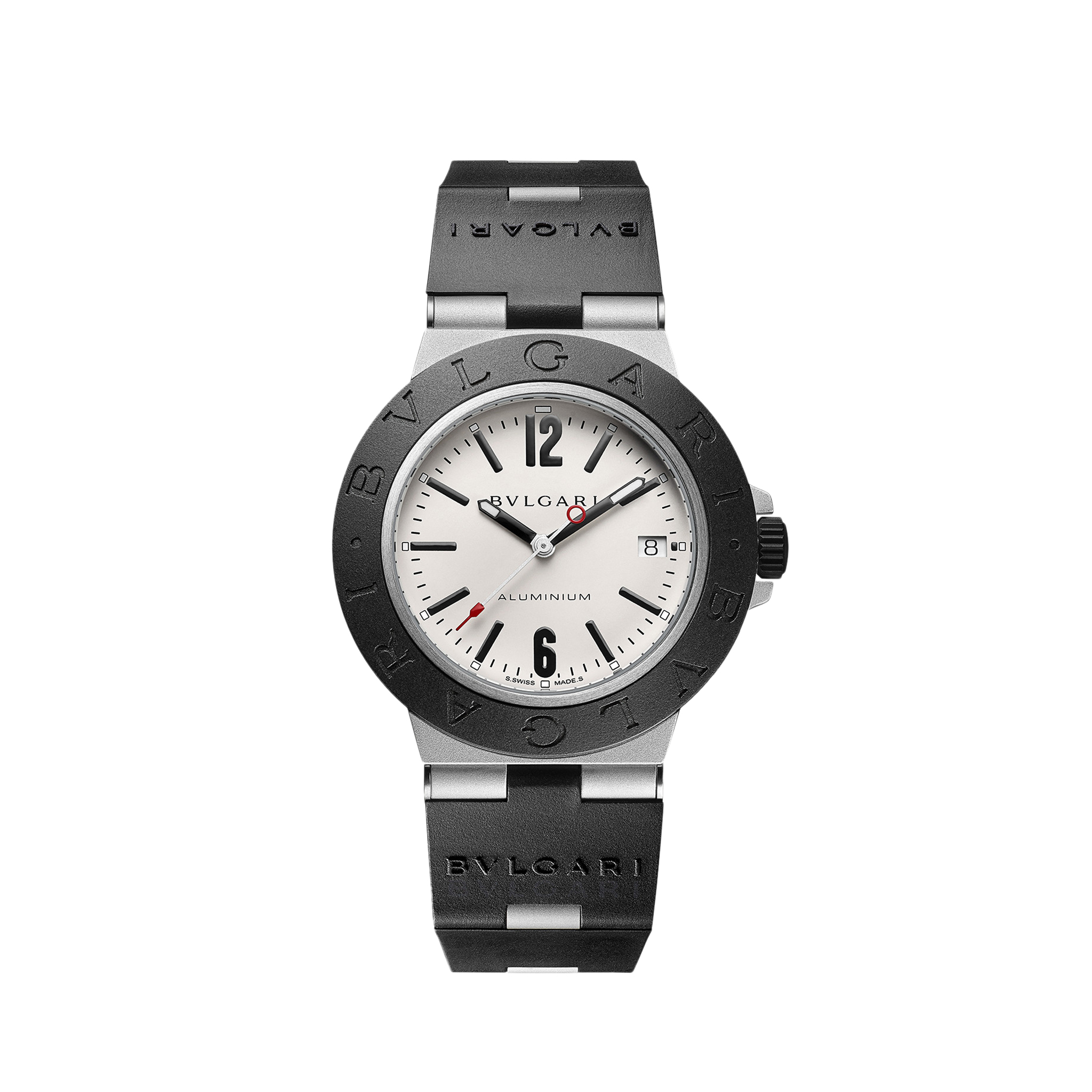 凭借 Bvlgari Aluminium 腕表,该品牌为奢华运动腕表树立了新标准。铝和钛金属表壳配有带双标志的黑色橡胶表圈。在带黑色时标的灰色表盘上,日期窗口位于三个位置o'clock. 这款时计搭载自制自动上链机芯,黑色橡胶表带点睛之笔。