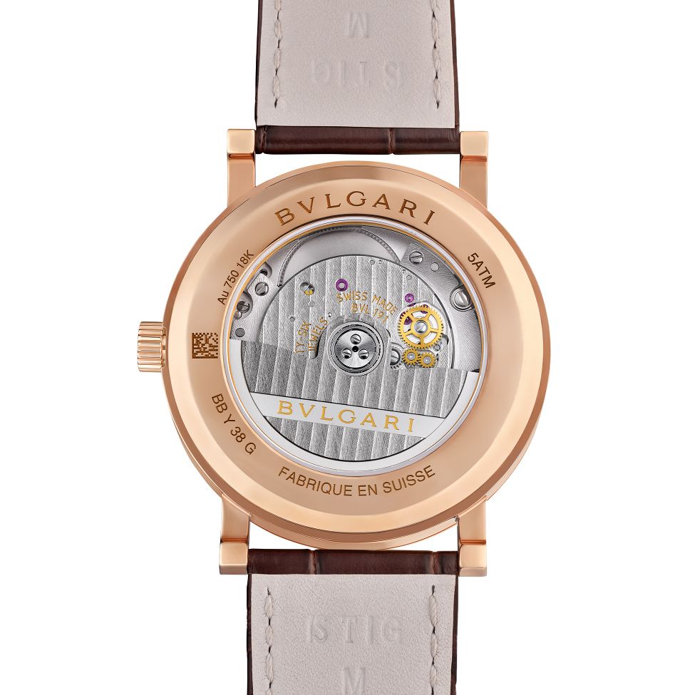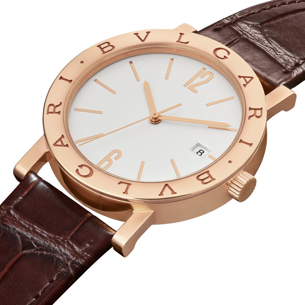 Bvlgari Bvlgari 手表是一款优雅的杰作,表壳和表圈均采用 18K 玫瑰金打造,表圈上印有著名的 Bvlgari 双徽标。白色和乳白色表盘与棕色鳄鱼皮表带相得益彰,表带以针扣固定。这款手表搭载 BVL191 "solotempo "自动机芯,提供 42 小时动力储备,包括小时、分钟、中央秒针和日期等功能。
