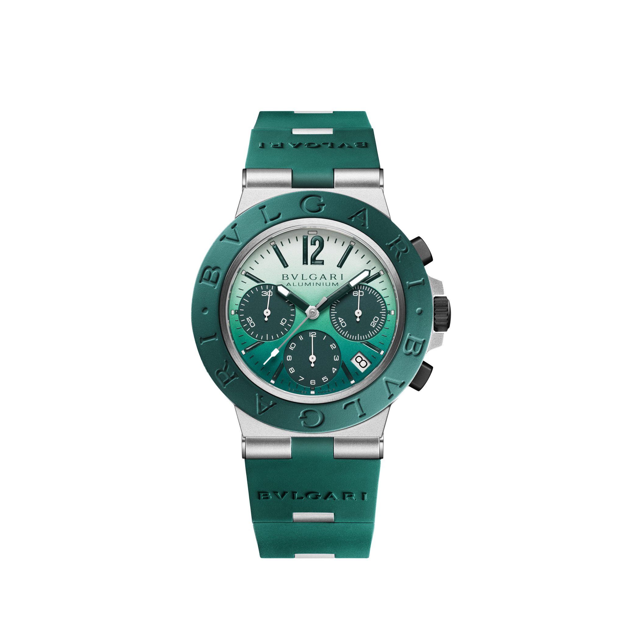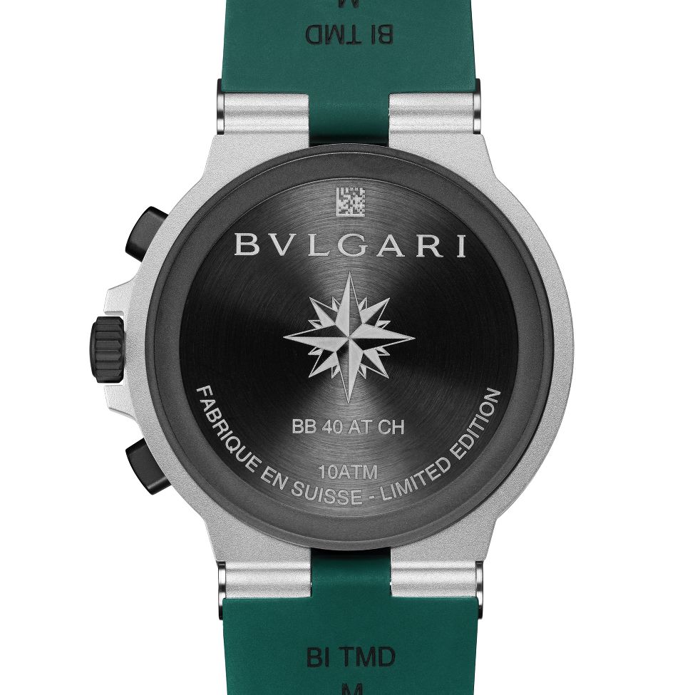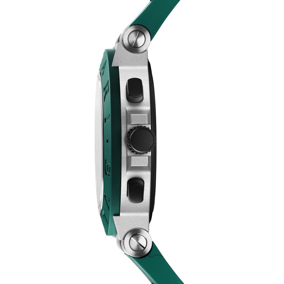 宝格丽 Octo Finissimo 配备绿色渐变表盘,40 毫米不锈钢表壳和带有铝合金链节的深绿色橡胶表带。由自动上链的 B130 型机芯驱动,动力储备为 42 小时。这款手表防水深度达 100 米。