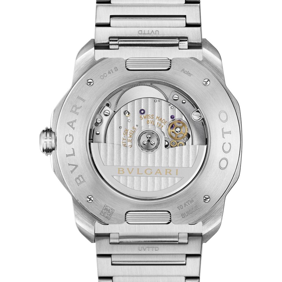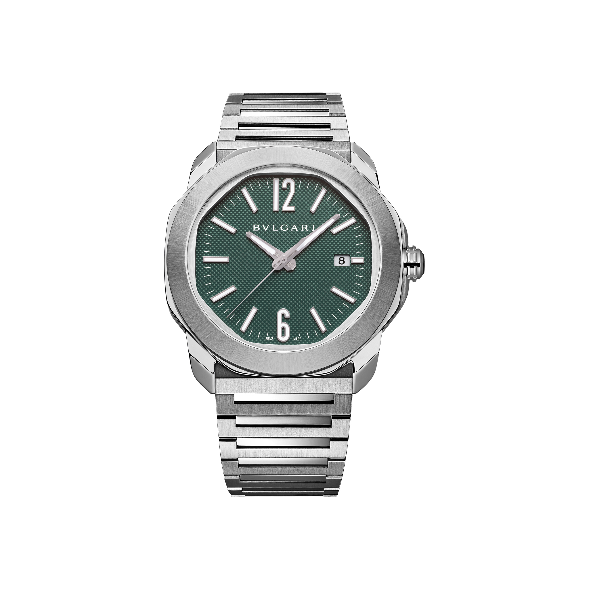 Octo Roma腕表采用拉丝与抛光精钢打造,绿面"巴黎钉纹"表盘搭配Super-LumiNova®夜光指针与时标,清晰易读。内置自动上链BVL 191自制机芯,功能包括时、分、中央秒针与3点钟位置日期。41毫米表壳防水深度达100米。