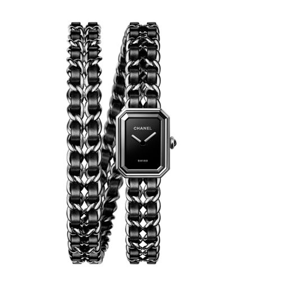 Première Chaîne Iconique Double Tour 腕表以不锈钢表壳搭配双圈缠绕小牛皮表带,展现香奈儿的摩登优雅。尺寸为19.7 × 15.2 × 7.5毫米,搭载高精度石英机芯,精准可靠,致敬品牌经典风格,为腕间增添精致魅力。
