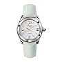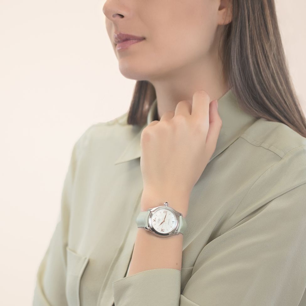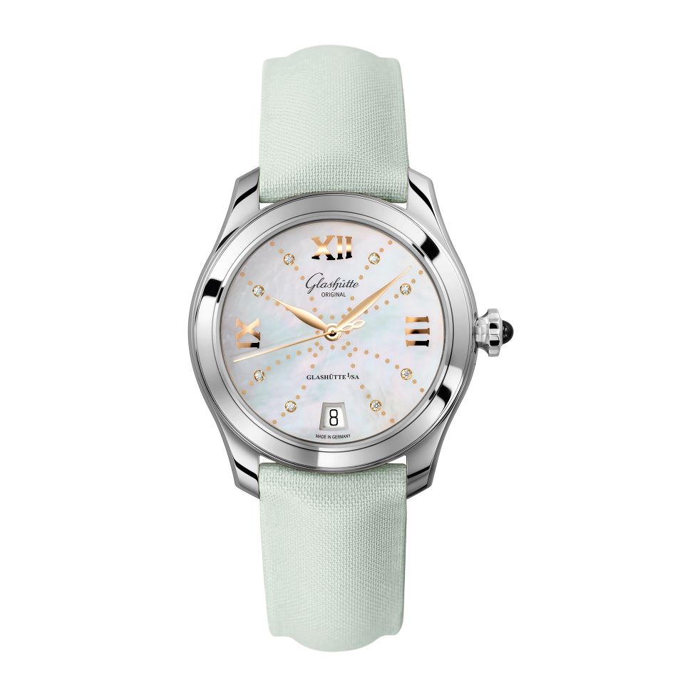 格拉苏蒂原创Lady Serenade系列彰显永恒的优雅。 不锈钢表壳与珍珠母贝表盘相得益彰,搭配白金色罗马数字和指针。 正下方为日期窗口,表冠上装饰着缟玛瑙凸面宝石。 通过透明表壳背面清晰可见39-22机芯,这款腕表可提供40小时的动力储备。 薄荷绿缎纹表带搭配针扣,为这款腕表增添点睛之笔。