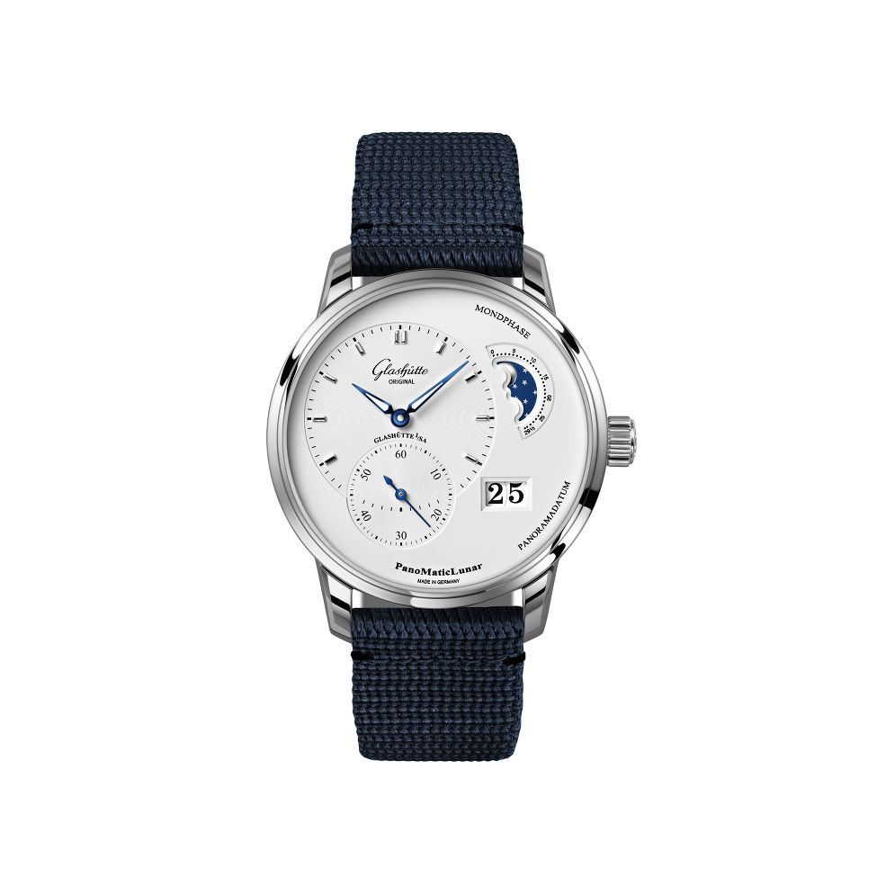 格拉苏蒂原创 PanoMaticLunar 手表以其优雅的设计和先进的技术功能而令人印象深刻。40 毫米精钢表壳包裹着银色表盘,表盘由精心制作的工序打造而成,银色刻度和蓝钢指针别具一格。大型全景日期显示和精确的月相显示完善了时间显示。机芯采用 90-02 型机芯,提供约 42 小时的动力储备,透过蓝宝石水晶表背可以看到高品质的做工和典型的格拉苏蒂装饰。