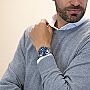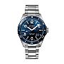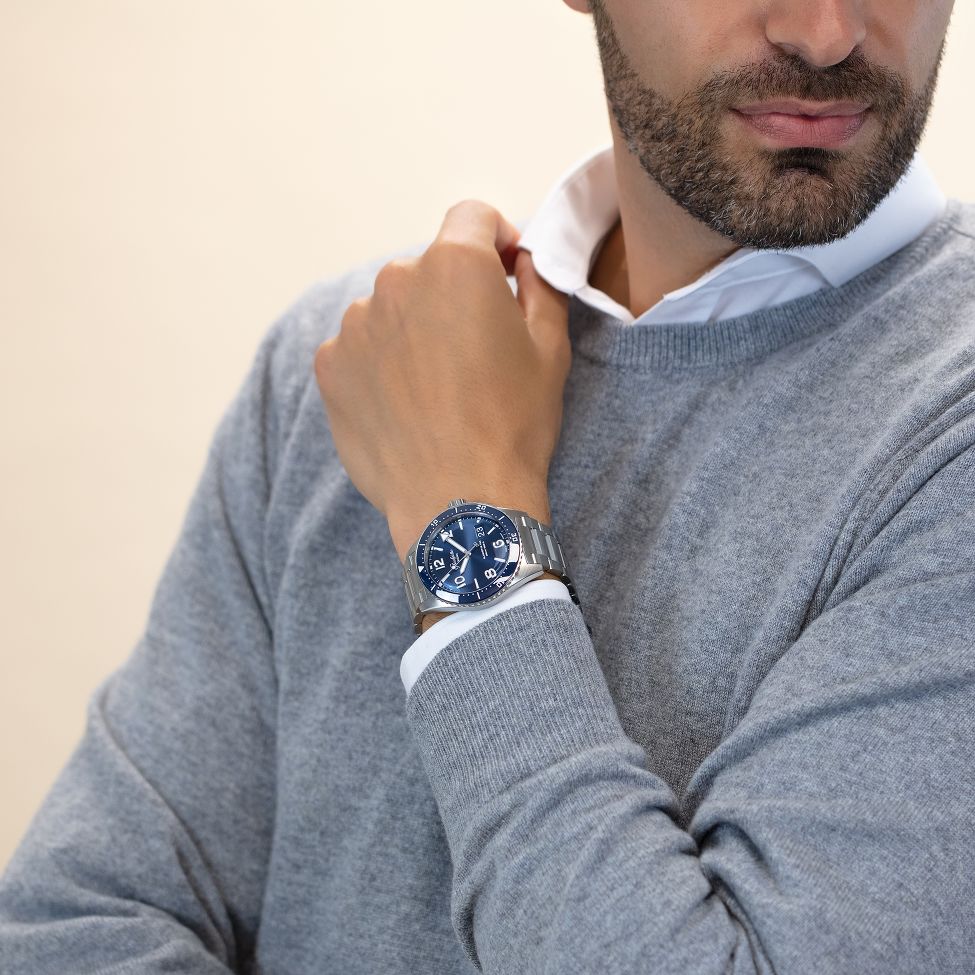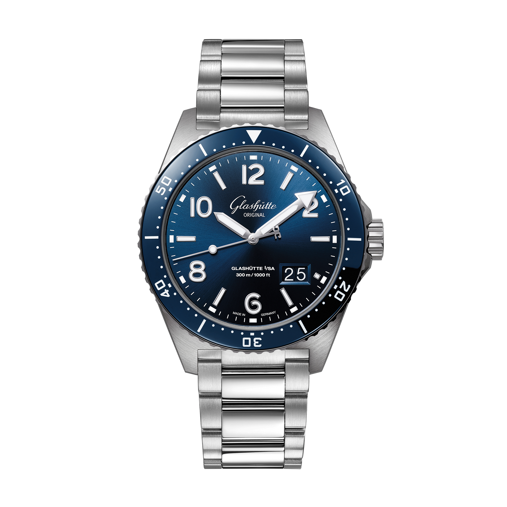 格拉苏蒂原创SeaQ Panorama Date系列腕表,60年代晚期潜水表的复兴之作。 43.2毫米不锈钢表壳表壳配上旋转表圈,搭配电镀蓝色表盘,表盘上饰有日辉纹、贴花罗马数字及涂有Super-LumiNova®夜光涂层的时标和指针。 4点钟位置为大日历;搭载36-13自动机芯,通过透明表壳背面清晰可见。 不锈钢链式表链增添点睛之笔。