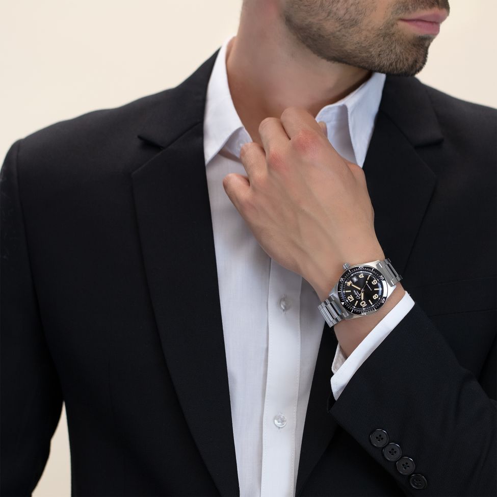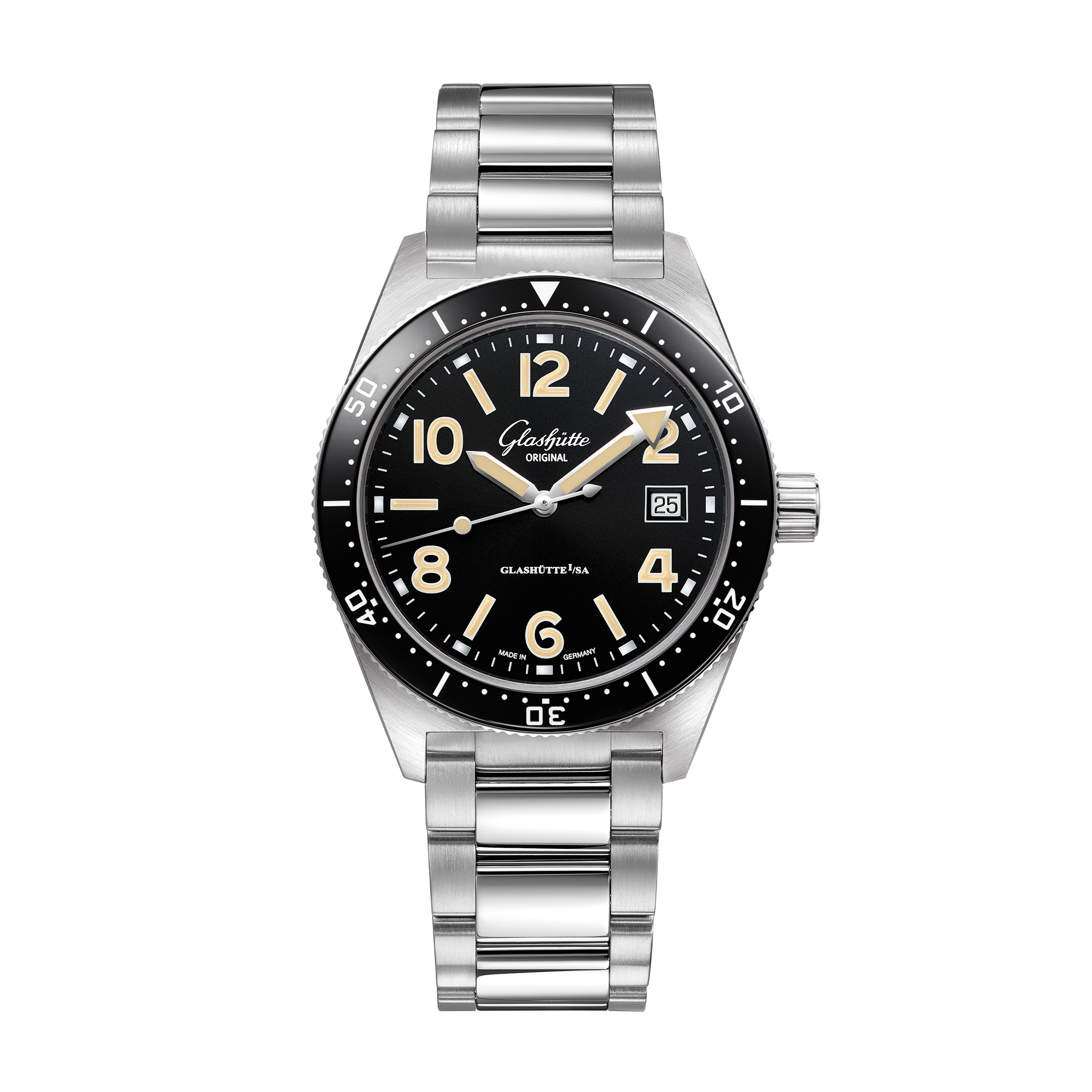格拉苏蒂原创SeaQ系列腕表,计时精准,致敬冒险家的无畏精神。 39.5毫米不锈钢表壳配上旋转表圈,搭配电镀黑色表盘,表盘上饰有日辉纹、贴花罗马数字及涂有Super-LumiNova®夜光涂层的时标和指针。 正右侧设有日期窗口;这款腕表搭载39-11自动机芯。不锈钢链式表链增添点睛之笔。